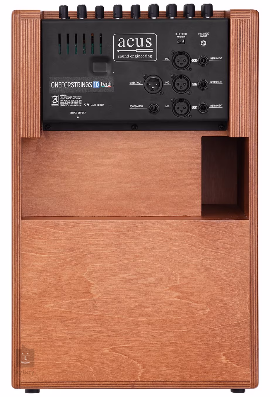Acus One ForStrings 10 Ferdi Wood je tříkanálové akustické kombo z řady Ferdi s novým rozhraním/systémem Ferdi-UXLogic, výkonem 250 wattů a dvěma vstupy (mikrofonním a nástrojovým) na každém kanálu. Každý kanál má k dispozici samostatný třípásmový ekvalizér, ovladač hlasitosti, gainu (-12 až +15 dB) a úrovně zvoleného zabudovaného efektu. První kanál navíc nabízí sekci kompresoru a třípolohový přepínač, který mění charakter EQ podle zvoleného typu nástroje (Flat - lineární odezva, stejné EQ jako kanály 2 a 3, Bass - pro nástroje s bohatými basy jako představuje akustická baskytara nebo kontrabas, Jazz - ideální pro lubové/jazzové kytary).