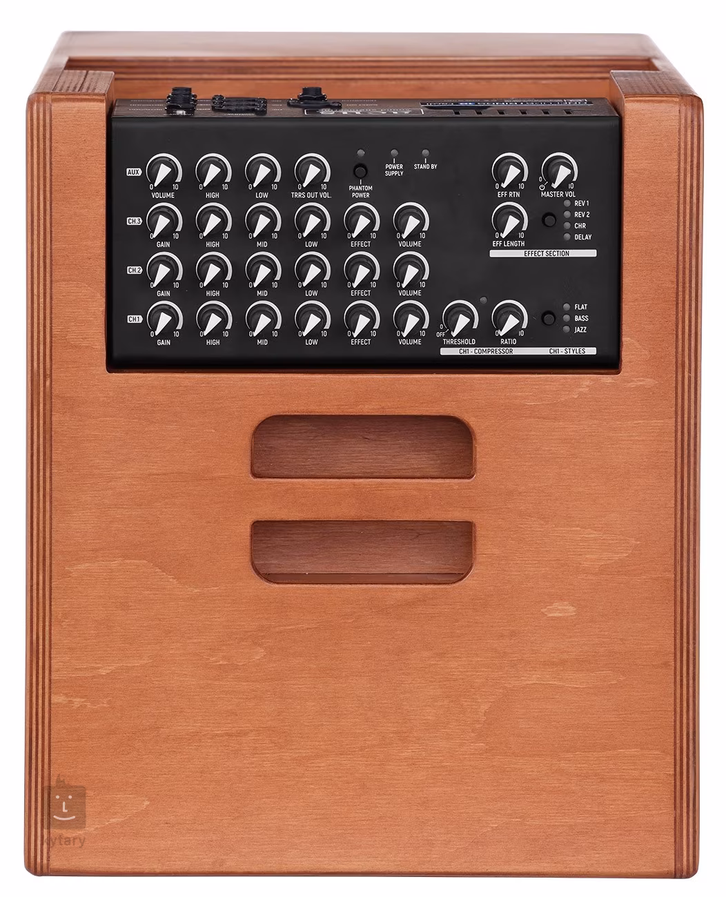 Efektová sekce nabízí čtyři typy efektů (Short Reverb, Long Reverb, Chorus, Delay) a možnost nastavení délky reverbu, rychlosti chorusu a delay time. Samostatnou kapitolou je Aux kanál s konektory Bluetooth audio in a TRRS audio in/out, díky kterým vám Acus OneForStrings 10 umožní poslouchat a hrát do vaší oblíbené hudby z telefonu, MP3 přehrávače nebo notebooku, nahrávat a živě streamovat na populárních sociálních platformách. Kombo také nabízí možnost zapojení kondenzátorových mikrofonů díky volitelnému fantomové napájení, symetrický XLR Direct Out výstup pro propojení komba s mixem nebo PA a vstup pro footswitch (není součástí balení), přes který lze zapínat/vypínat zvolený efekt.