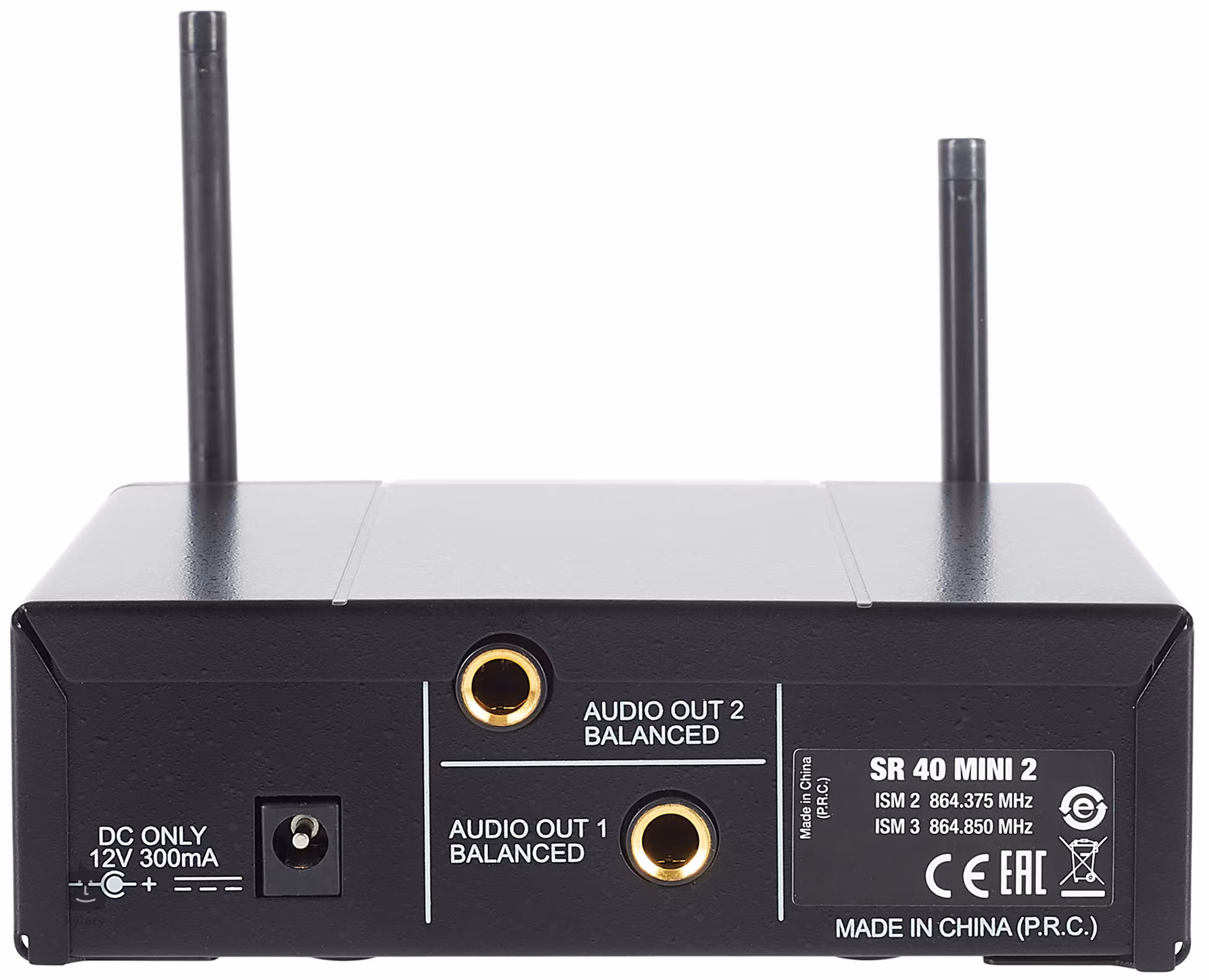 Přijímač SR 40 Mini2 je duální verzí SR 40 Mini a poskytuje stejné praktické funkce jako jednokanálový SR 40 Mini. Ovládacích prvků přijímače SR 40 Mini2 je poskrovnu, nabízí ale vše potřebné: Potenciometry výstupní hlasitosti, LED indikátory přítomnosti signálu a clippingu pro každý kanál, sdružené ON/OFF tlačítko pro vypnutí. Přijímač se přizpůsobí elektrickým rozvodům v takřka všech zemích světa, poradí si totiž s napětím v rozsahu 110-240V a obsahuje adaptéry pro různé zásuvky.