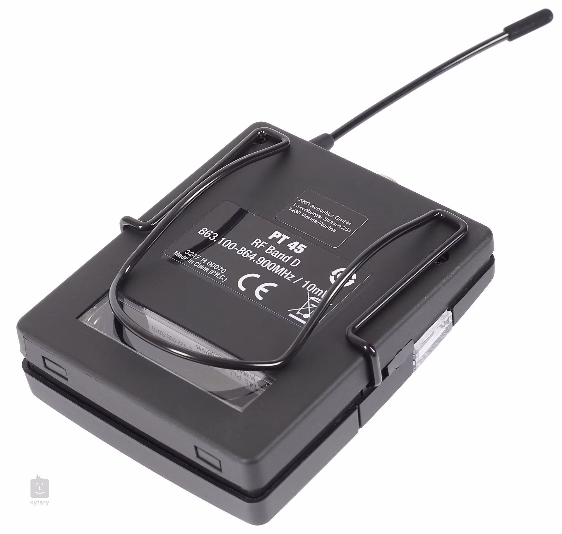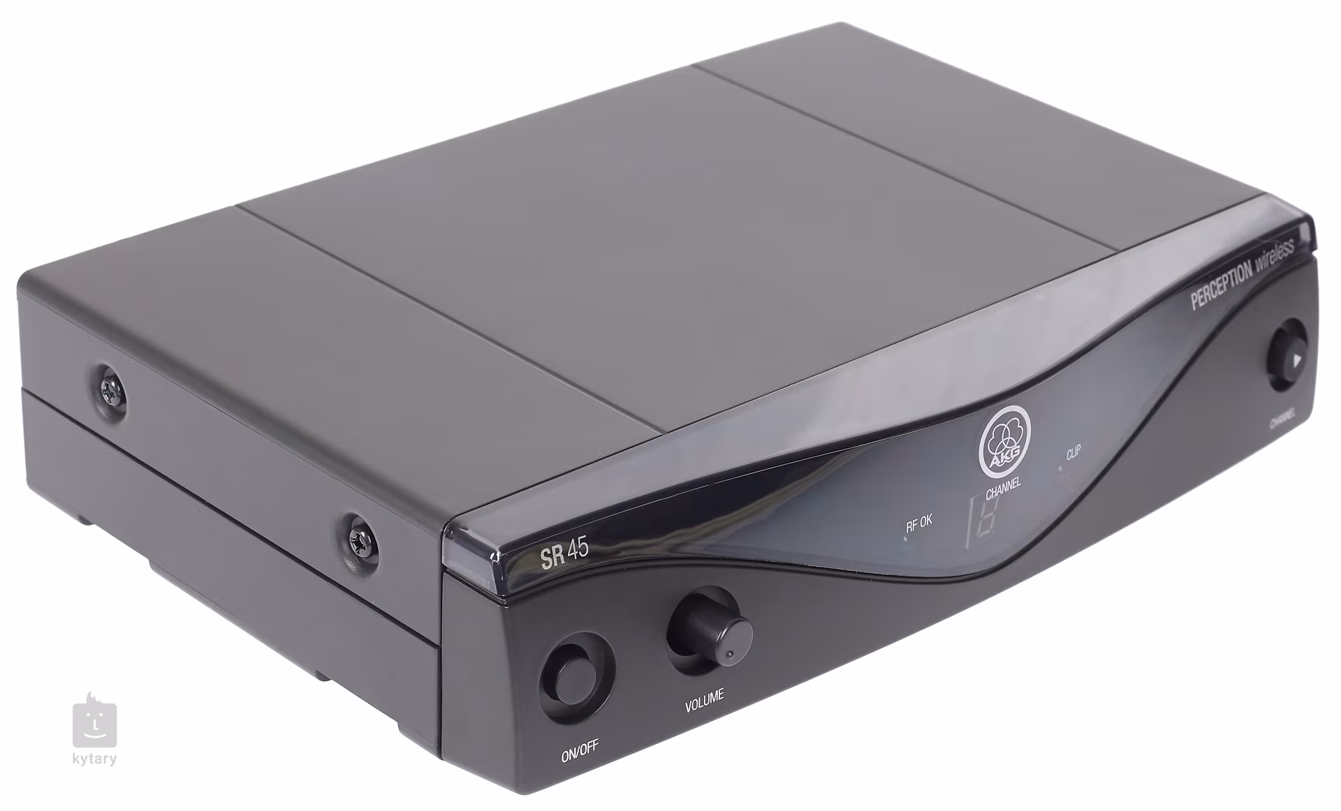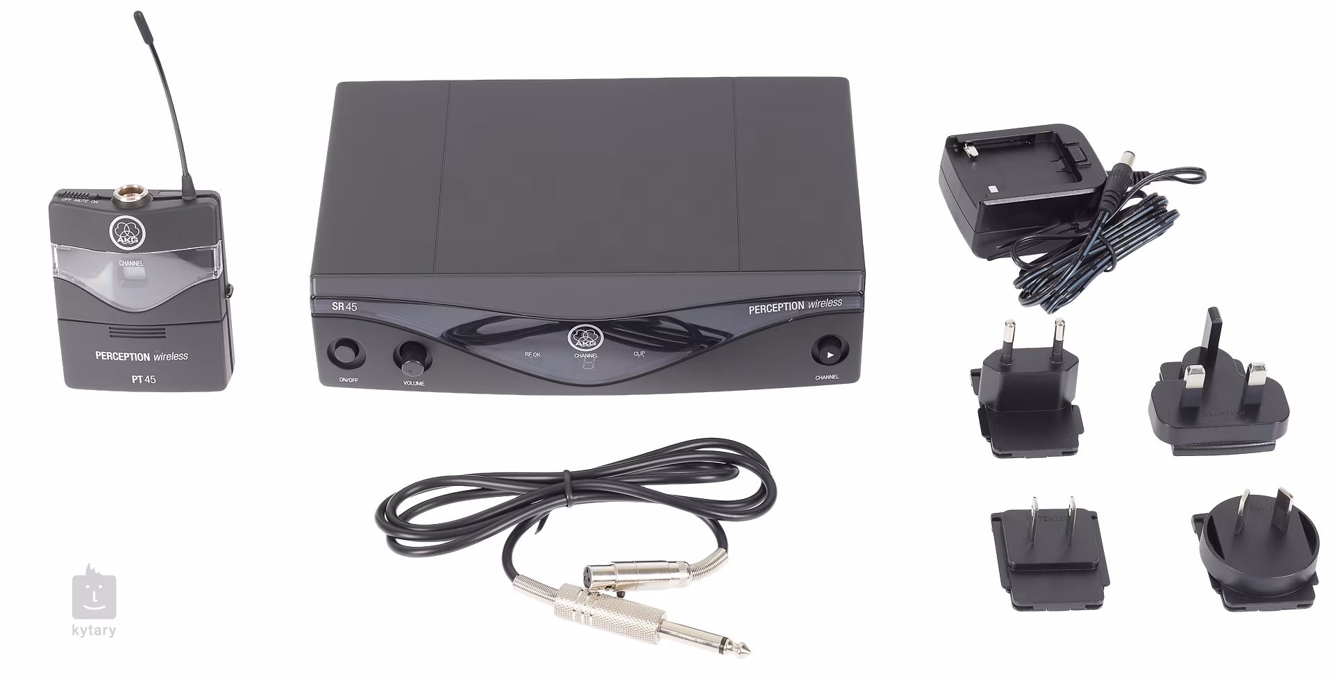 Součástí setu AKG Perception Wireless Instrumental Set je přijímač AKG SR45 a bodypack AKG PT45. Přijímač má na svém šasí minimum ovládacích prvků, přesto není nastavování parametrů nijak ochuzeno. K ovládání slouží potenciometr Volume, tlačítko Channel pro přepínání kanálů, LED displej zobrazující zvolený kanál, LED indikátory signálu a clippingu, vypínač a trimr pro nastavení squelche. Výstupy jsou osazeny XLR a 1“ Jack konektory. Bodypack PT45 je vůbec nejmenším a nejlehčím vysílačem ve své třídě a kromě toho je kompatibilní s miniaturními mikrofony AKG MicroMics, které umožňují kvalitní ozvučení všech běžných nástrojů. PT45 je vybaven displejem, LED indikátorem stavu baterie a vypínačem, pod krytkou baterie najdeme přepínač kanálů a trimr pro nastavení vstupní úrovně. Bodypack je napájen jednou AA baterií, na níž dosahuje životnosti až 10 hodin.