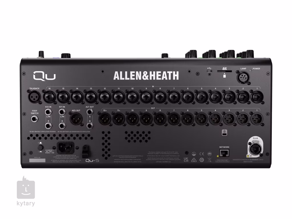 Mixpult Allen&Heath QU-5 je nejkompaktnějším modelem z celé řady. Jako takový je osazen šestnácti kombinovanými vstupy XLR/Jack, dvěma linkovými stereo vstupy (2x 2 Jack TRS 6,3 mm), dvanácti XLR výstupy a dvěma linkovými výstupy (Jack TRS). Na jeho ovládacím panelu pak najdete celkem sedmnáct citlivých 100mm táhel pro snadné nastavení jednotlivých kanálů. Jeho srdcem je výkonné jádro XCVI FPGA o vzorkovací frekvenci 96 kHz, které přináší bezkonkurenční zvukovou kvalitu. K dispozici jsou také možnosti DEEP Processing, které vám umožní rozšířit základní funkce mixu o vysoce kvalitní pluginy, jež často napodobují reálné modely kompresorů, preampů a jiných zařízení pro dosažení profesionálního audia.
