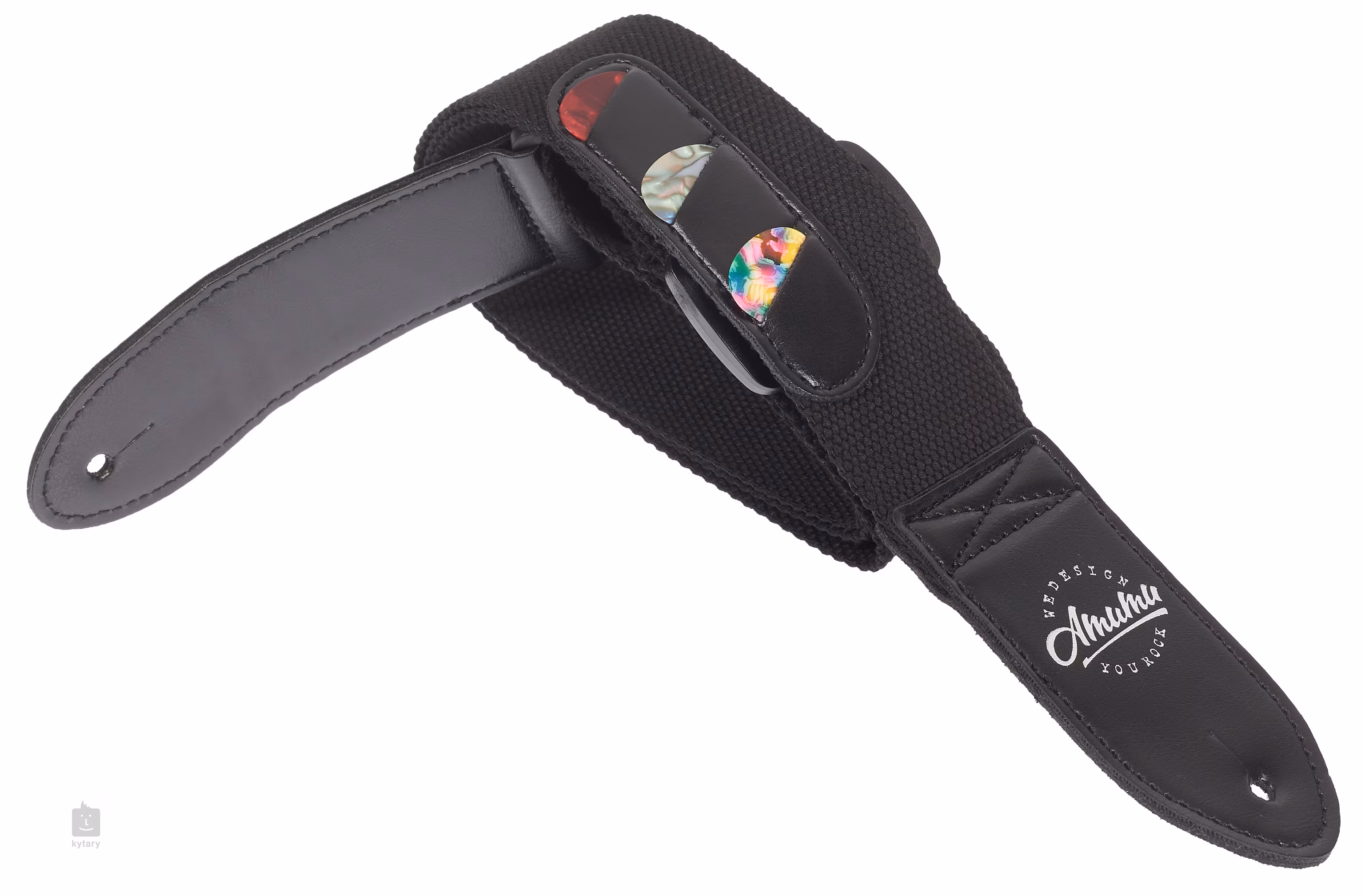 AMUMU Cotton Pickholder Strap Black je kvalitní bavlněný popruh. Délka je nastavitelná a hodí se pro většinu hráčů. Zároveň je díky tomu možné použít tento popruh, kromě kytary a baskytary, například na ukulele nebo mandolínu. Konce jsou ze semišové kůže pro delší životnost. Kromě nich naleznete na popruhu tři kožené kapsičky na trsátka. V případě, že máte na nástroji pouze jednu rolnu, v balení naleznete tkanici, pomocí které lze druhý konec popruhu připevnit k hlavici nástroje. Zdobení představuje vyražené logo společnosti.