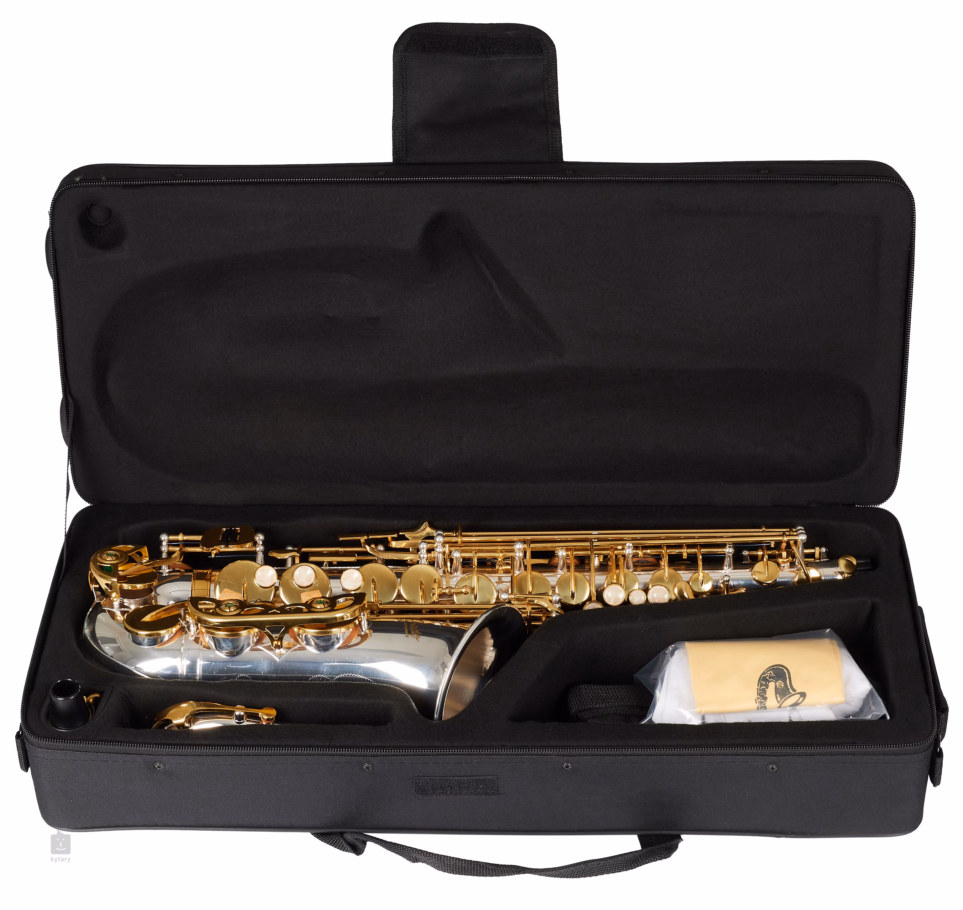 Altový saxofon BAS-100SG nabízí postříbřené tělo a mosazené pozlacené klapky. Saxofon je dodáván v měkkém pouzdru spolu s příslušenstvím (popruh, vytěrák).