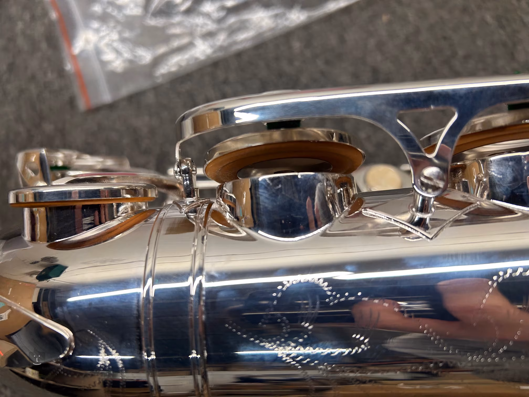 Zdeformované tónové otvory na nejnižších tónech, protlačenina na H klapce (viz foto).