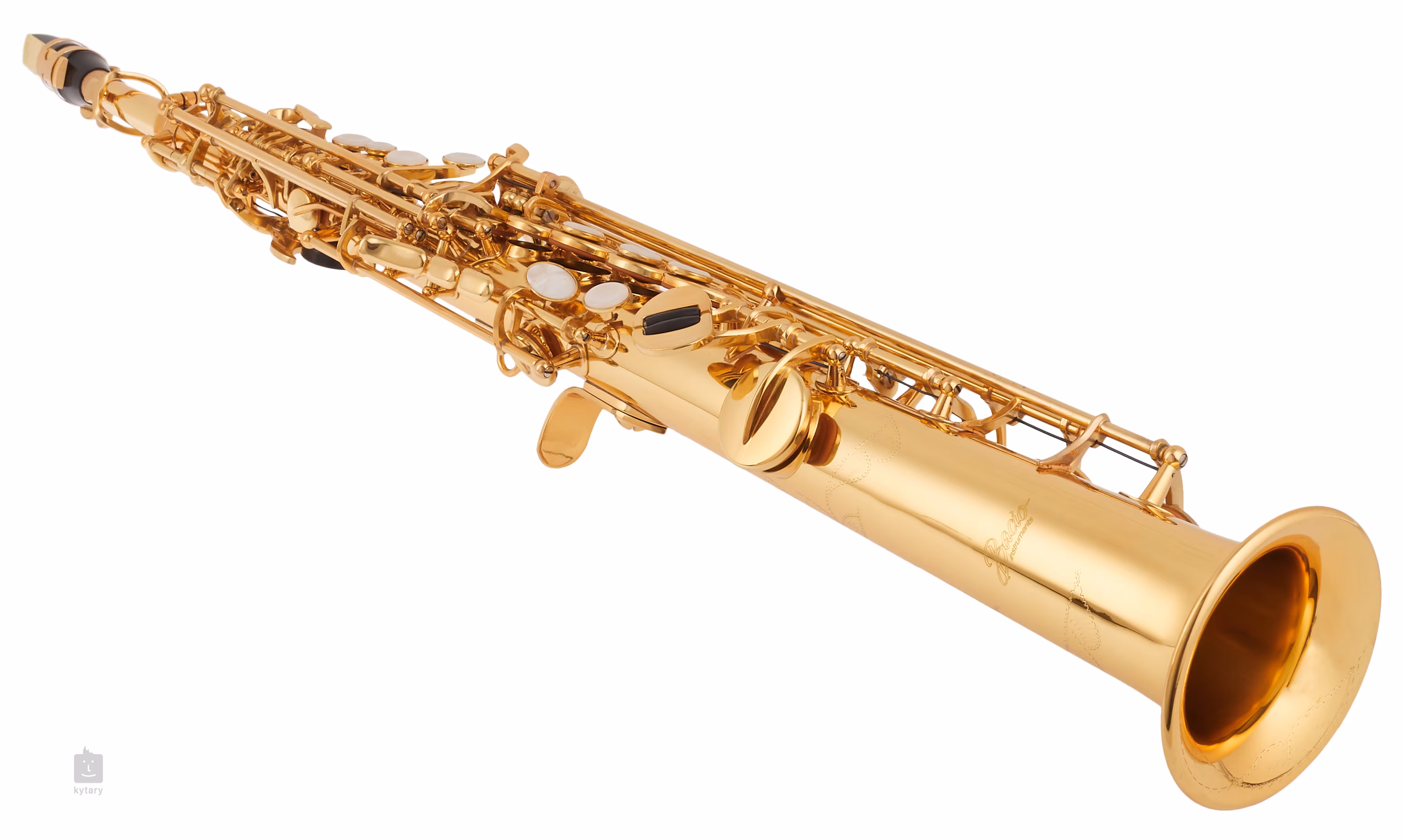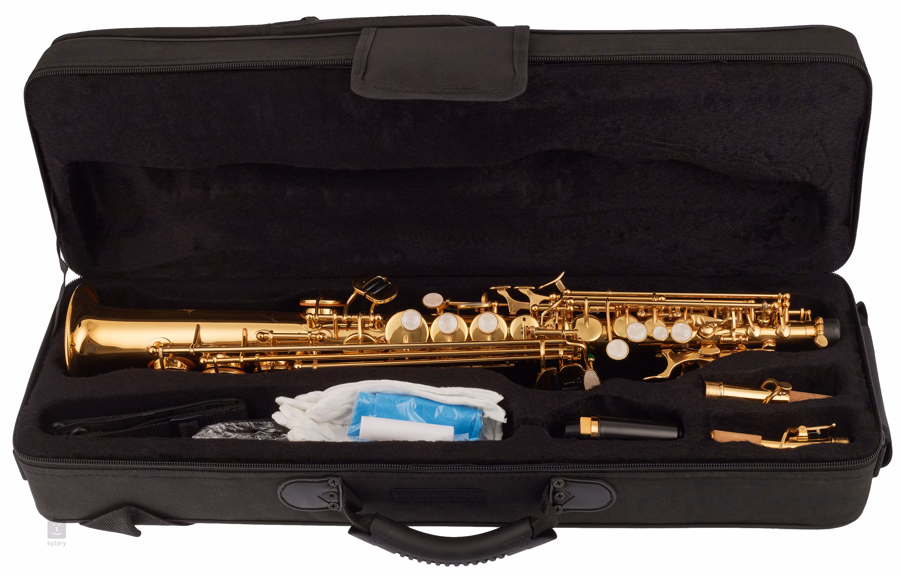 Sopránový saxofonBSS-100 nabízí tělo a klapky opatřené zlatolakem. Saxofon je dodáván v měkkém pouzdru spolu s hubičkou. ligaturou a příslušenstvím.