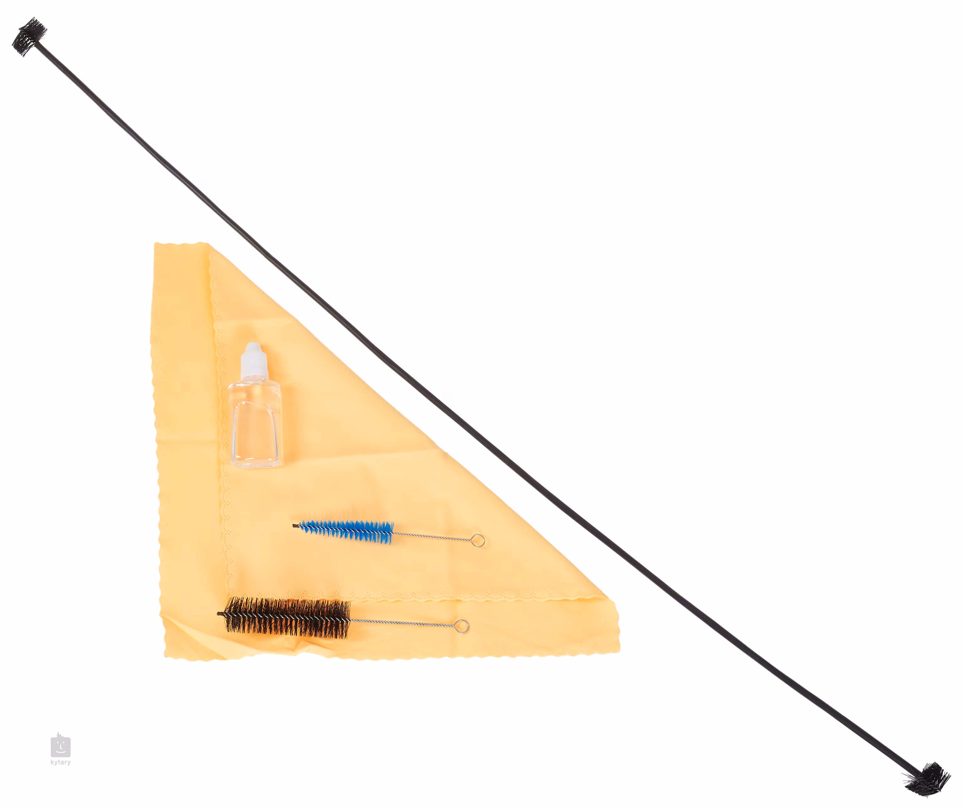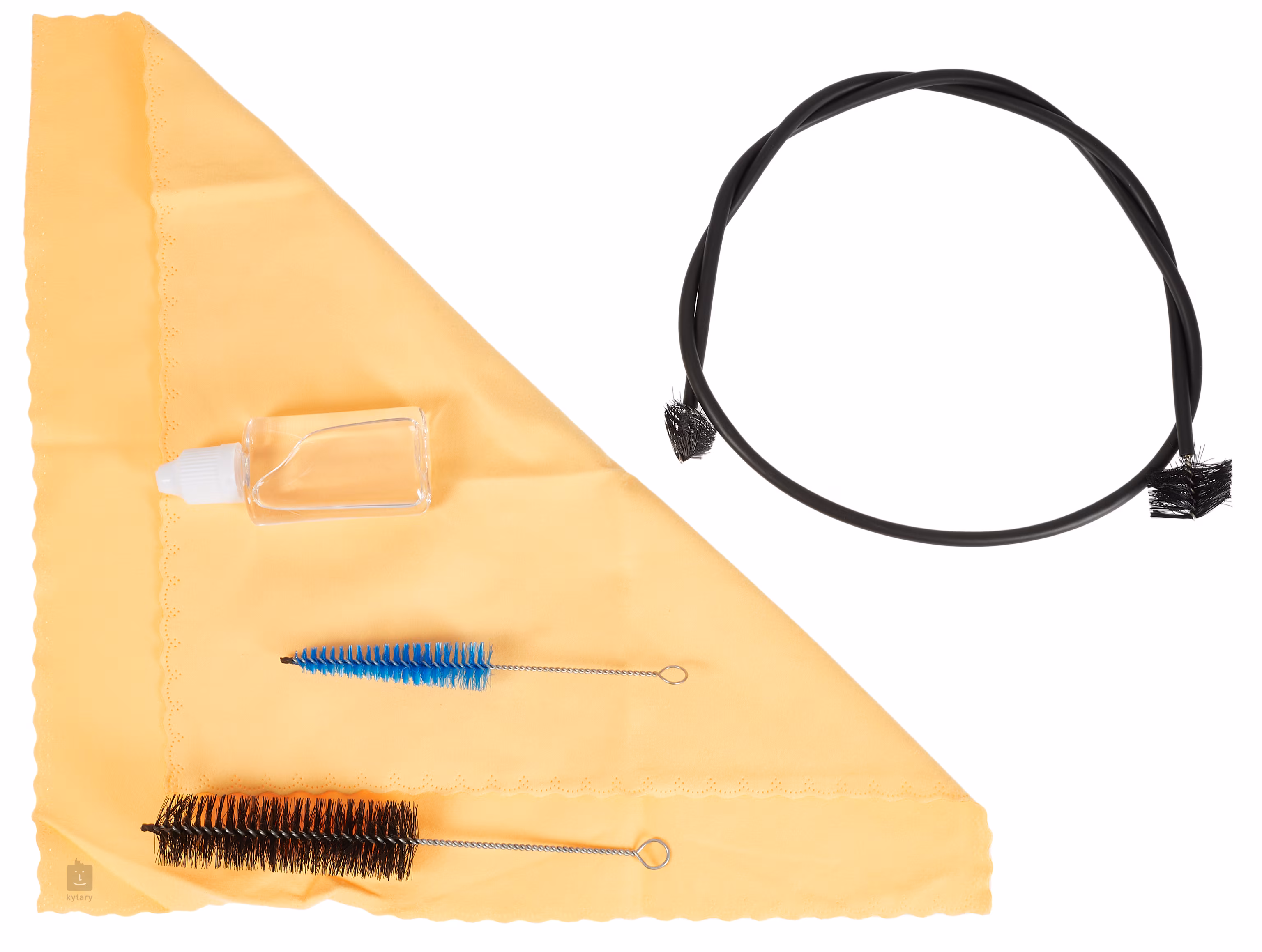 Čistící sada pro trubku Bacio Trumpet Care Kit obsahuje kartáček na nátrubek, vytěrák korpusu (bore snake), kartáček na ventily a pouzdra ventilů, olej na čištění ventilů a hadřík.