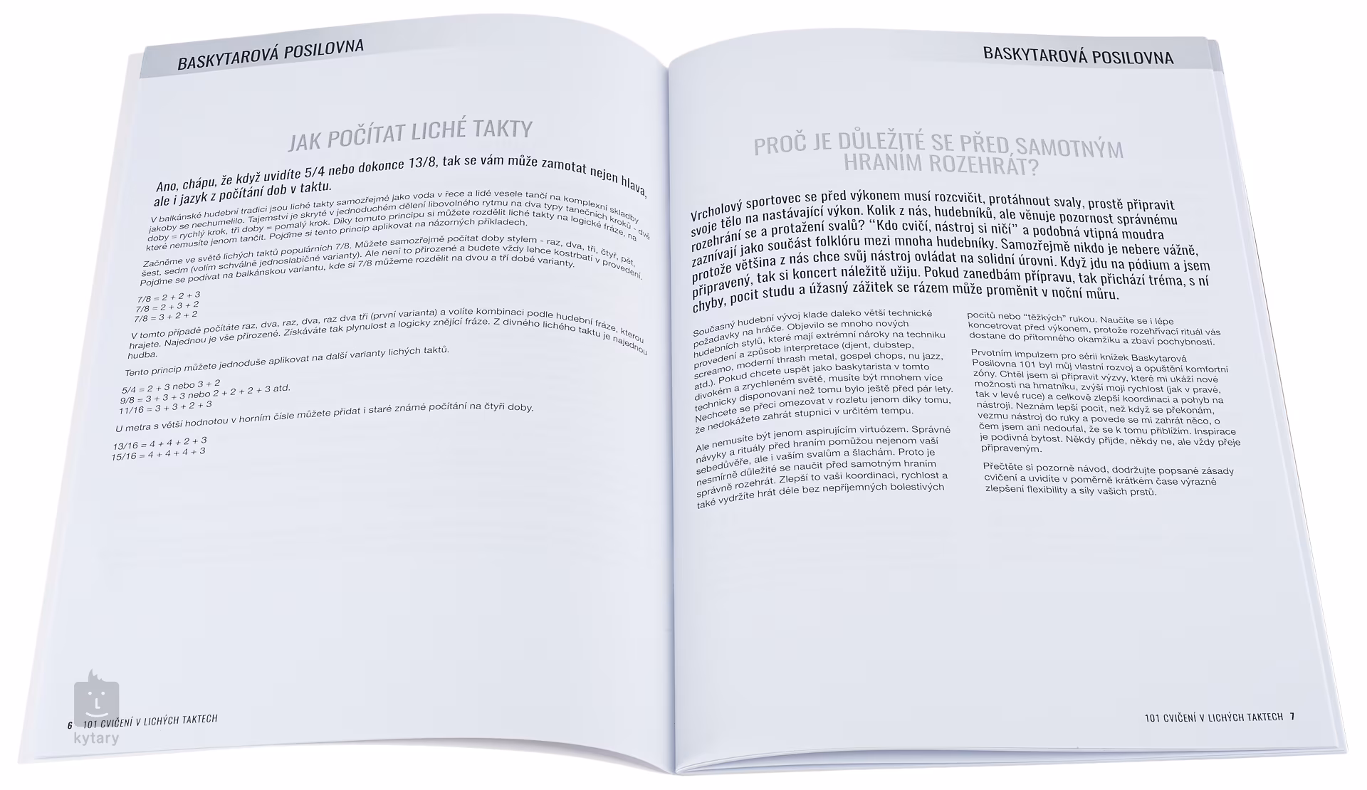 V knize si vyzkoušíte hraní ve všech možných variantách lichých taktů v dělení na čtvrtiny, osminy nebo šestnáctiny (5, 7, 9, 10, 11, 13 a 15) a také jejich vzájemné kombinace nebo kombinace se známými 4/4, 6/8 nebo 2/4 a 3/4 takty.