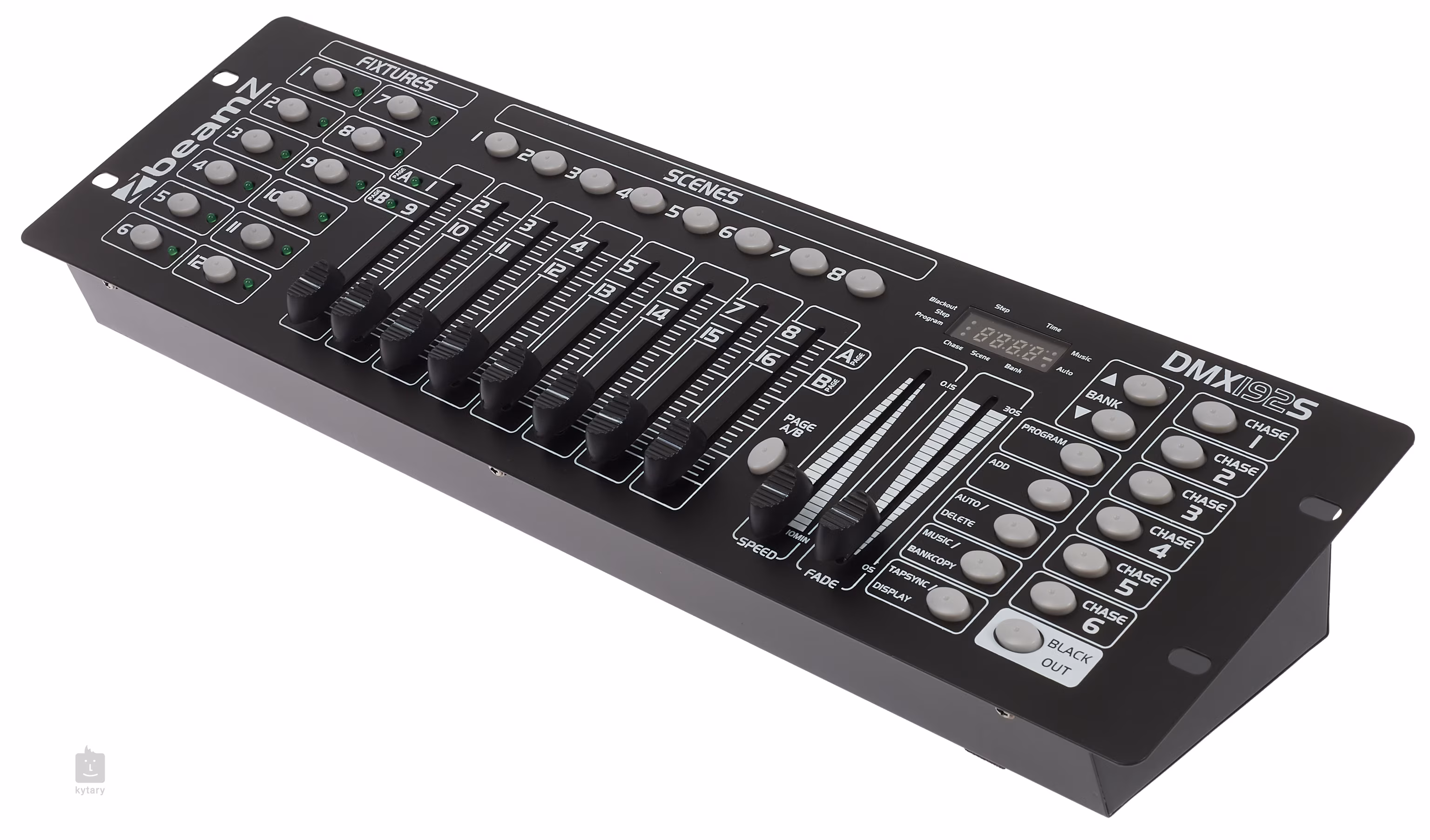 DMX-192S od společnosti BeamZ je profesionální DMX kontroler, který nabízí zlatou střední cestu mezi rozsáhlými možnostmi ovládání a kompaktními rozměry. Jedná se rackový kontroler do 19“ racku. Zařízení vám umožní řídit 12 svítidel a u každého z nich ovládat až 16 kanálů. Celkově tedy zvládne 192 kanálů. Kromě toho vám umožní naprogramovat až 240 scén a vytvářet z nich sekvence neboli chases. K dispozici je 8 paměťových bank pro scény (každá pojme 30 scén) a 6 sekvencí (každá sekvence může obsahovat až 240 kroků).
