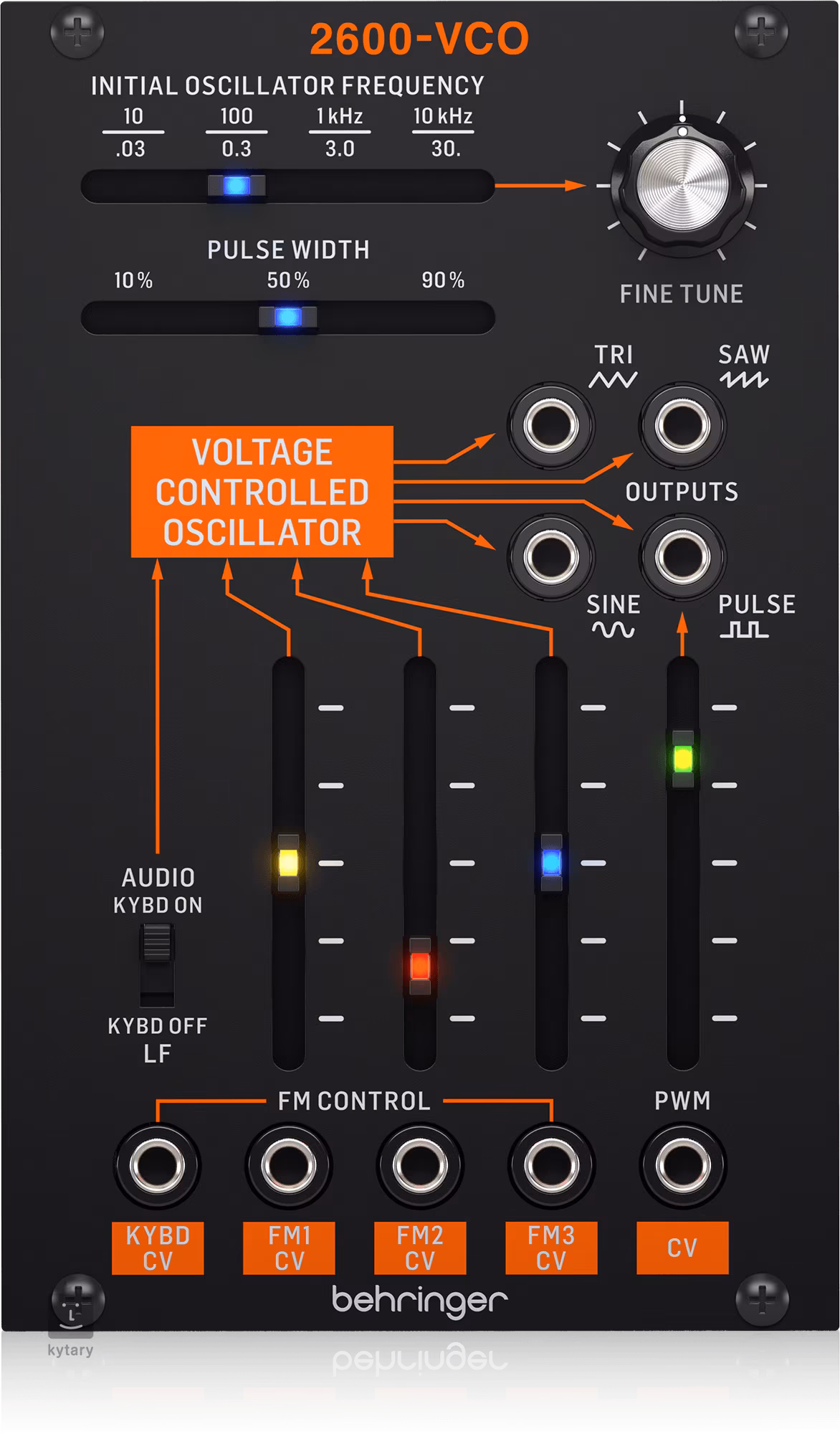 Modul 2600-VCO je bohatý na funkce a nabízí čtyři současné vlnové tvary: sinus, trojúhelník, pila a puls, které poskytují širokou paletu zvukových možností. Frekvenci oscilátoru lze nastavit v rozsahu 10 Hz až 10 kHz a od 0,03 Hz do 30 Hz v režimu LF. VCO lze také doladit k jiným nástrojům nebo VCO pomocí knoflíku Fine Tune. Šířku pulzu lze nastavit v rozsahu od 10 % do 90 %.