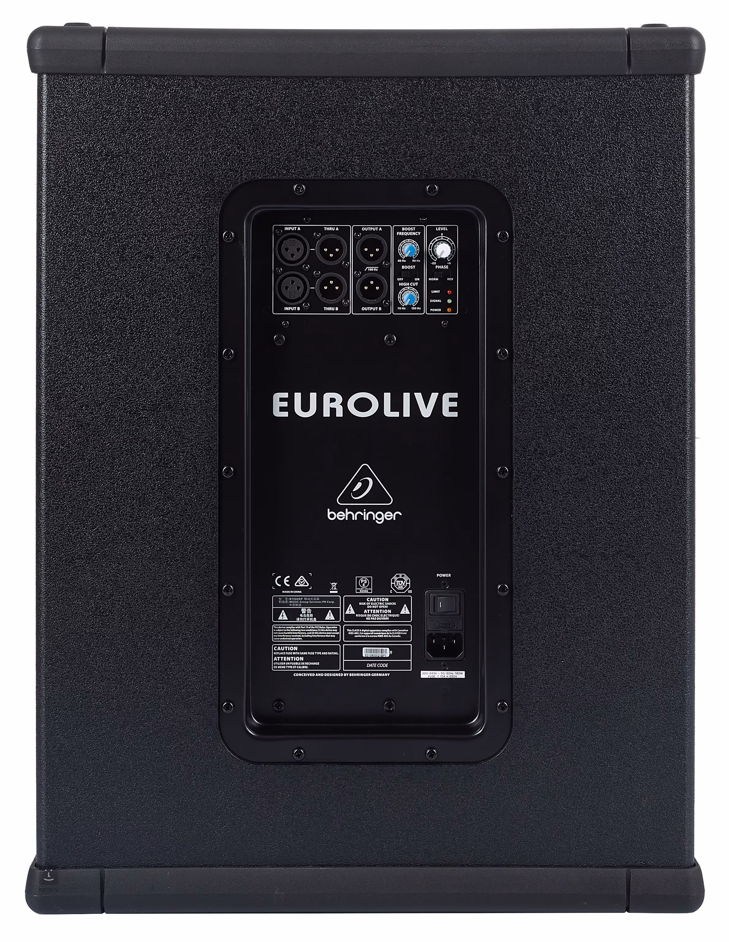 Uvnitř odolné konstrukce B1500XP se nachází 15“ reproduktor, který vám spolu se zesilovačem třídy D poskytne maximální výkon až 3000 W. Hlavní panel potom disponuje High Cut filtrem (70 – 150 Hz), basovým boosterem (45 – 90 Hz), knobem pro úpravu hlasitosti a přepínač fáze. Dále zde naleznete dva XLR vstupy a výstup pro případné připojení k dalšímu PA systému. Pár robustních madel vám potom zajistí pohodlný a bezpečný transport mezi produkcemi.
