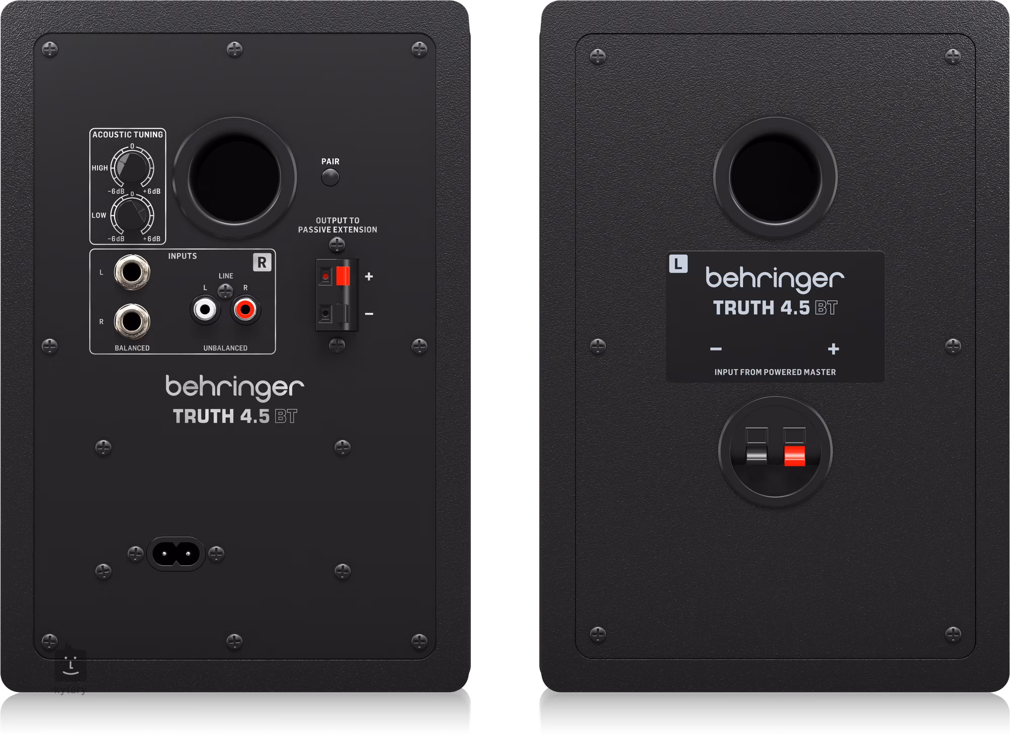 Model Behringer TRUTH 4.5 BT pčedstavuje pár aktivních studiových monitorů s technologií Bluetooth umožňující bezdrátovou konektivitu s různými zařízeními. Stejně jako jejich verze bez Bluetooth, nabízejí tyto monitory přesný a transparentní zvuk, nezbytný pro mixing a produkci. Každý z monitorů je osazen 4,5" wooferem ze skelných vláken a precizním 1" hedvábným měničem vysokých frekvencí. Díky této kombinaci činí frekvenční rozsah 60 Hz - 20 kHz.