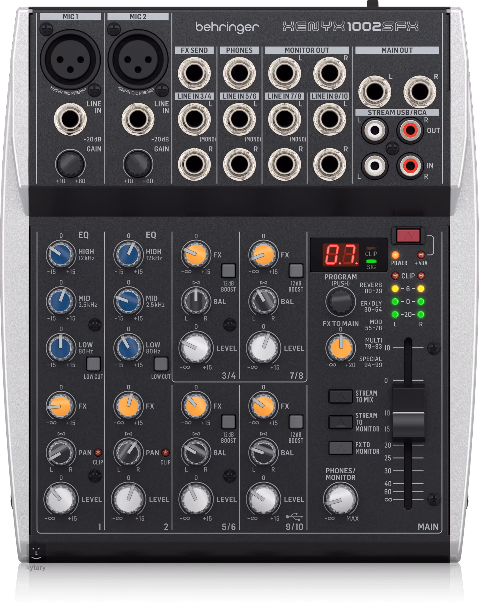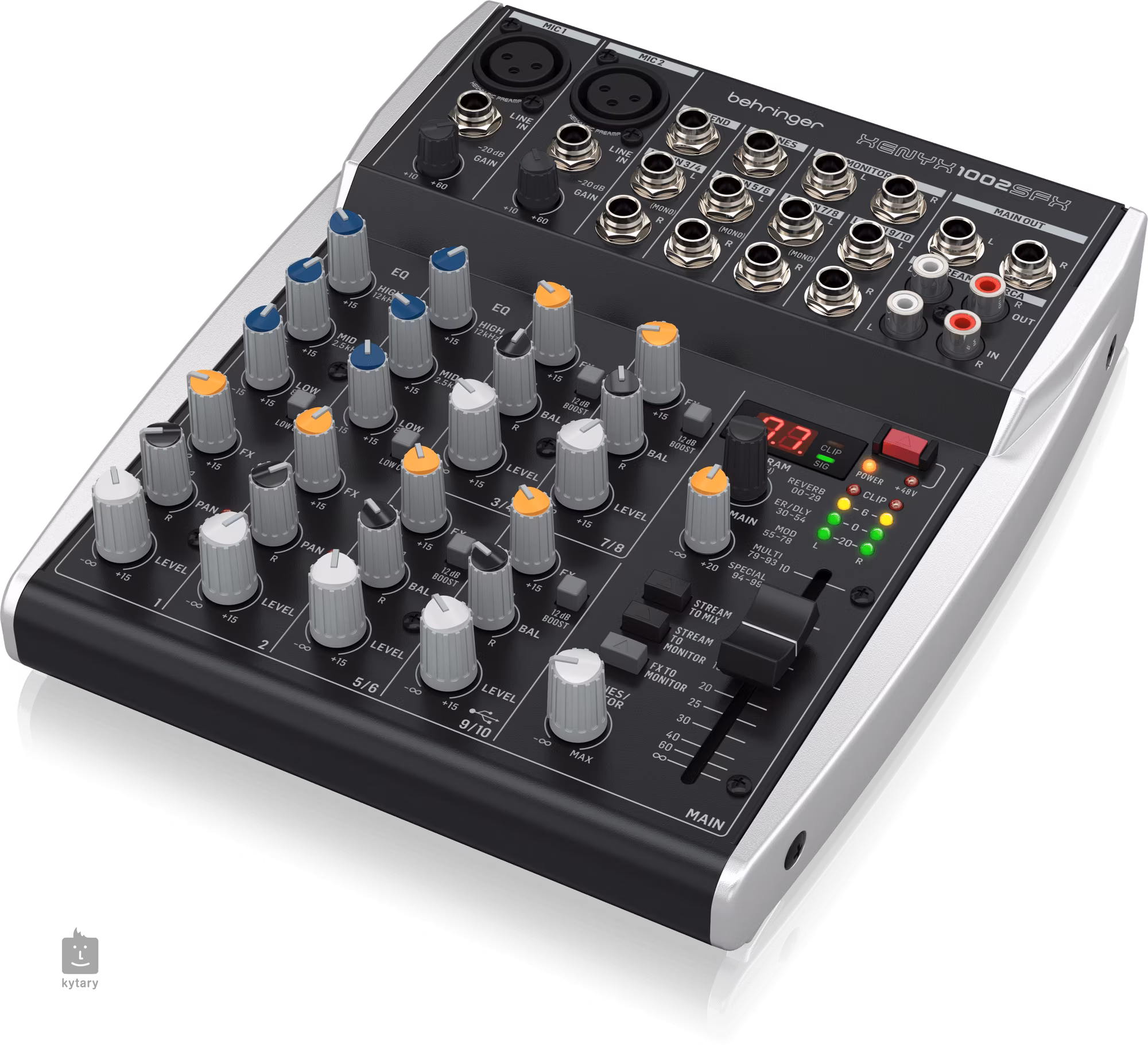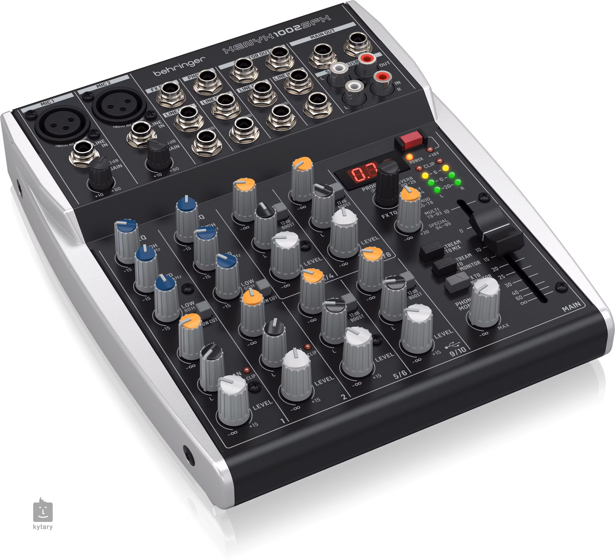 Behringer XENYX 1002SFX je analogový mixážní pult vhodný pro streamování, podcasting nebo nahrávání. Nabízí dva mono kanály s EQ a čtyři stereo kanály, vřelý a muzikální zvuk mikrofonních preampů XENYX, efektový procesor Klark Teknik se 100 presety, Stereo USB audio rozhraní pro propojení s počítačem a mobilními zařízeními, třípásmový ekvalizér, přímý mix PC/gaming zvuků ze stereo RCA streaming výstupu, stereo RCA vstup přiřaditelný k hlavnímu mixu/výstupu nebo výstupům do sluchátek/monitorů, stereo kanál 9/10 automaticky přepínající mezi TRS vstupem a USB playbackem a ovladač FX send pro externí efektové procesory/monitoring mix.