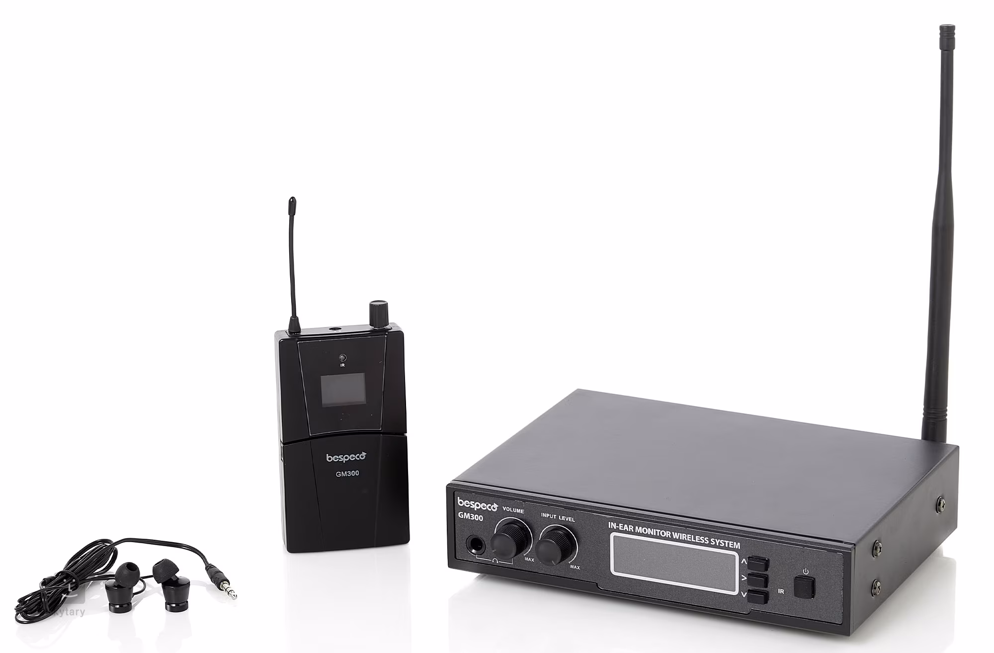 Bespeco GM300 je bezdrátový stereofonní monitorovací systém UHF. Set obsahuje in-ear sluchátka s vysílačem včetně dobíjecí baterie, přijímač, adaptér halfrack pro montáž do rackové jednotky. Všechna signálová připojení jsou symetrická. Provozní kanály jsou volitelné, současně lze používat až 20 systémů. Spojení mezi vysílačem a přijímačem probíhá prostřednictvím infračervených LED diod a to na vzálenost až 80 m. Doba potřebná k nabití baterie vysílače činí 3 hodiny.