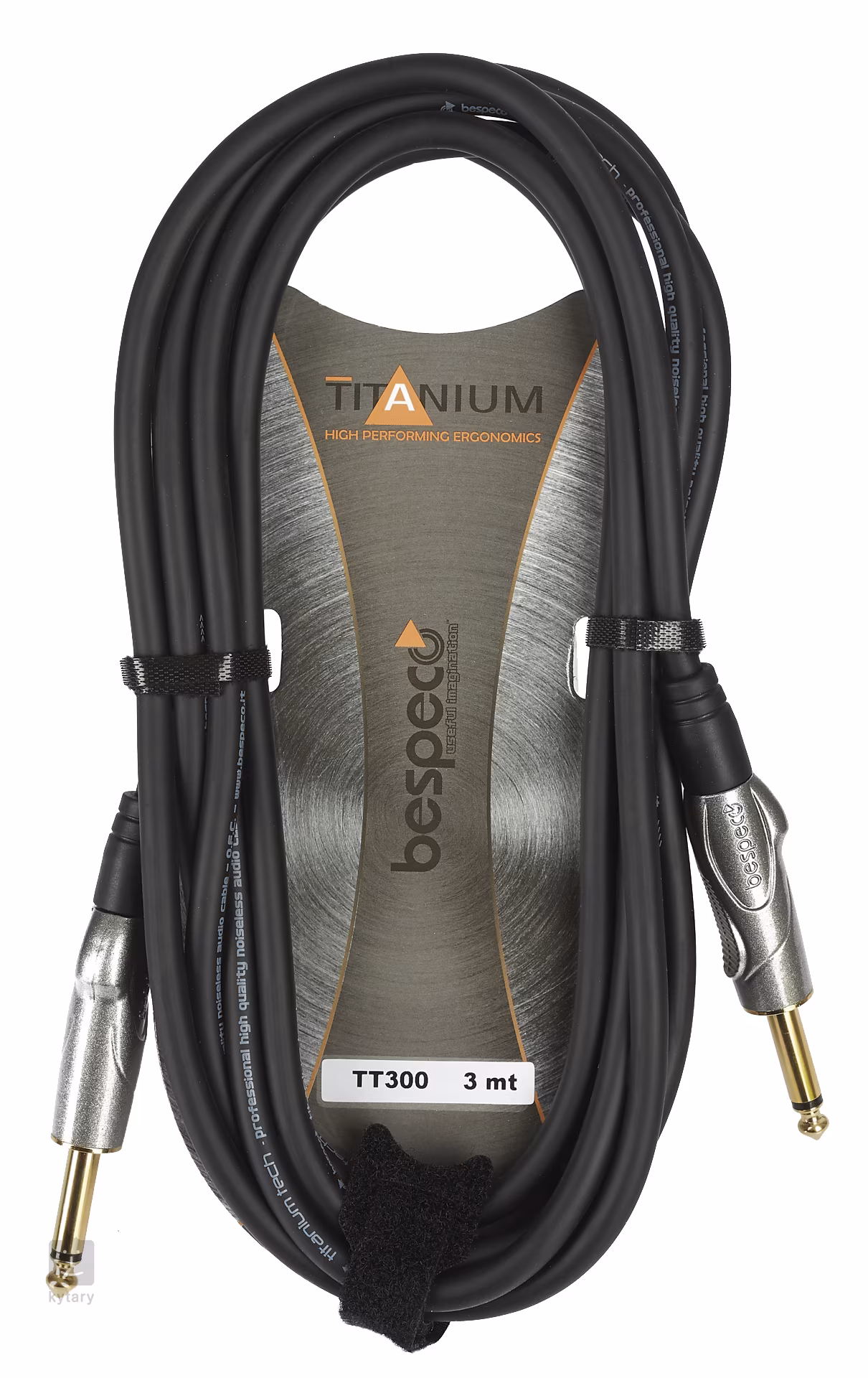 Bespeco Titanium je řada vysoce kvalitních nástrojových a mikrofonních kabelů. Zaujmou nejen svými perfektnímu zvukovými vlastnostmi, ale i unikátním a elegantním designem. Mezi výhody kabelů Titanium Tech patří kompletní pozlacení konektorů 24 karátovým zlatem, vyztužení vnitřních spojů pryskyřicí, průměr kabelu 7 milimetrů, silný a odolný plášť či účinné stínění kryjící 94% vodiče.