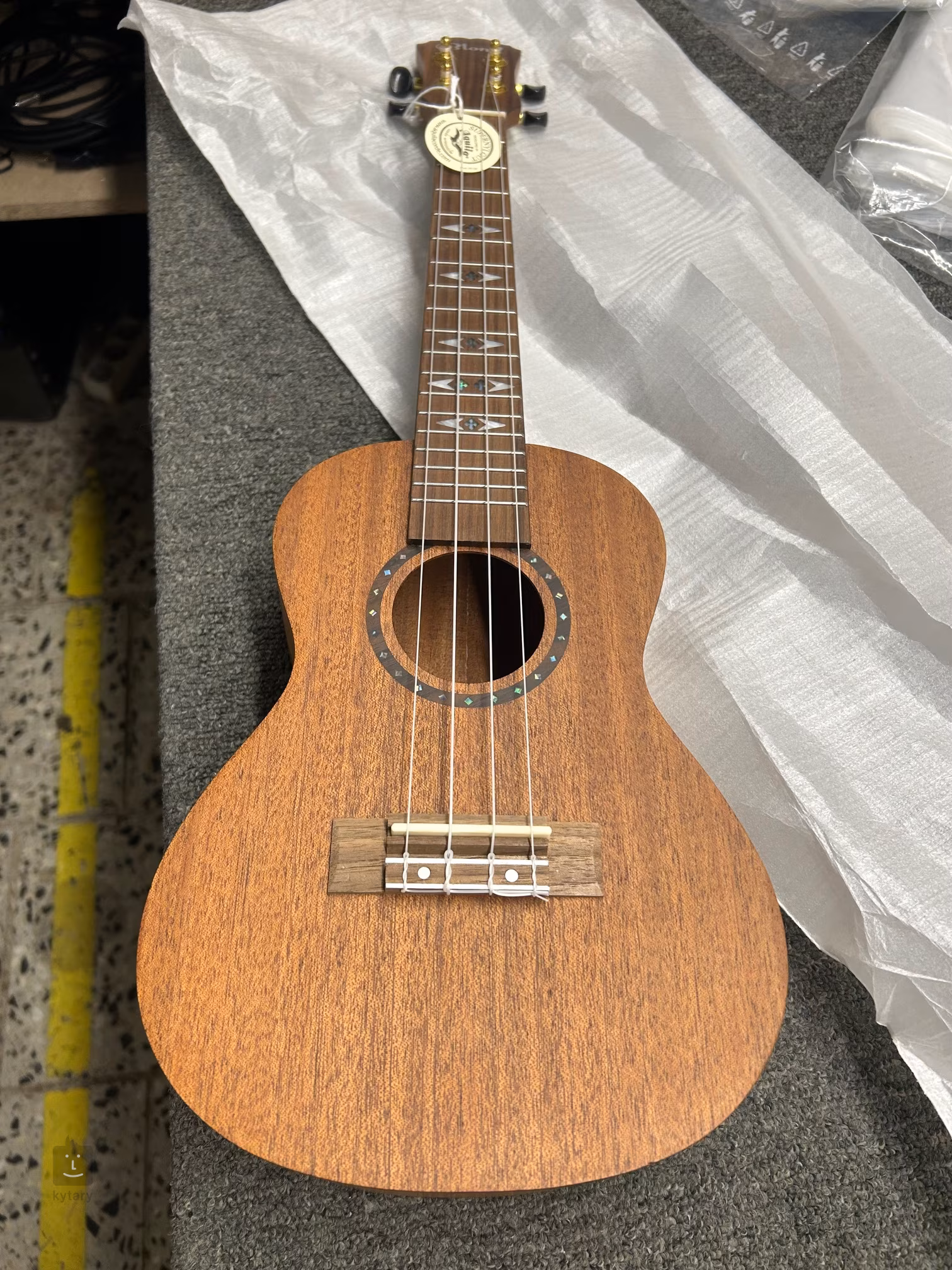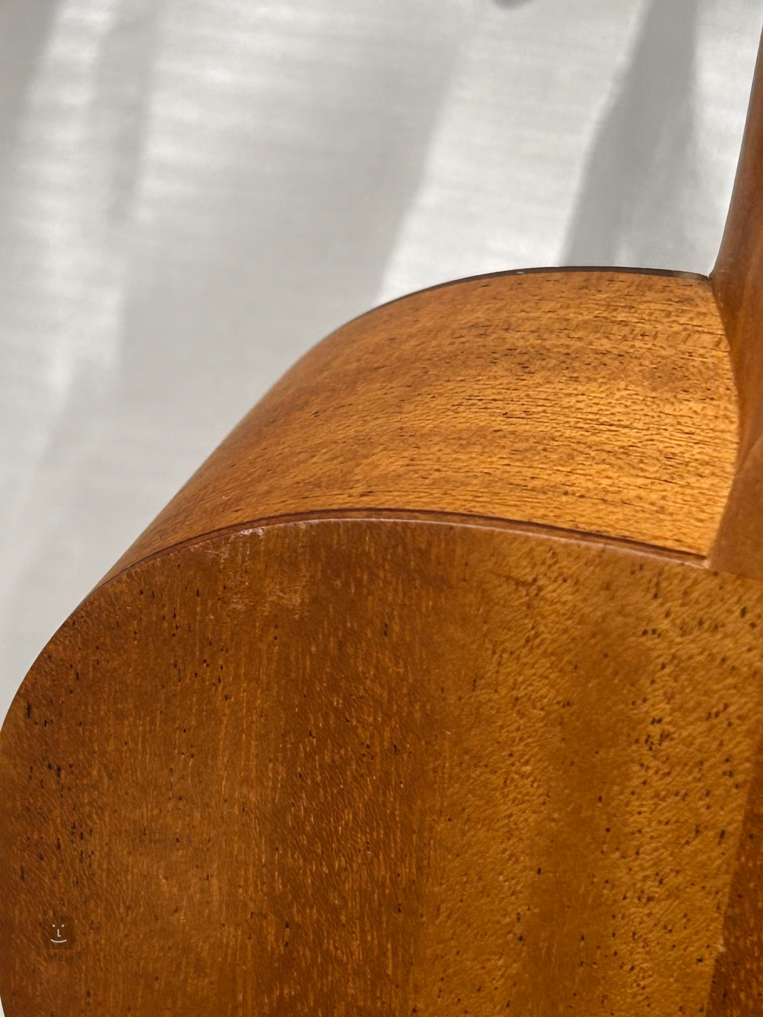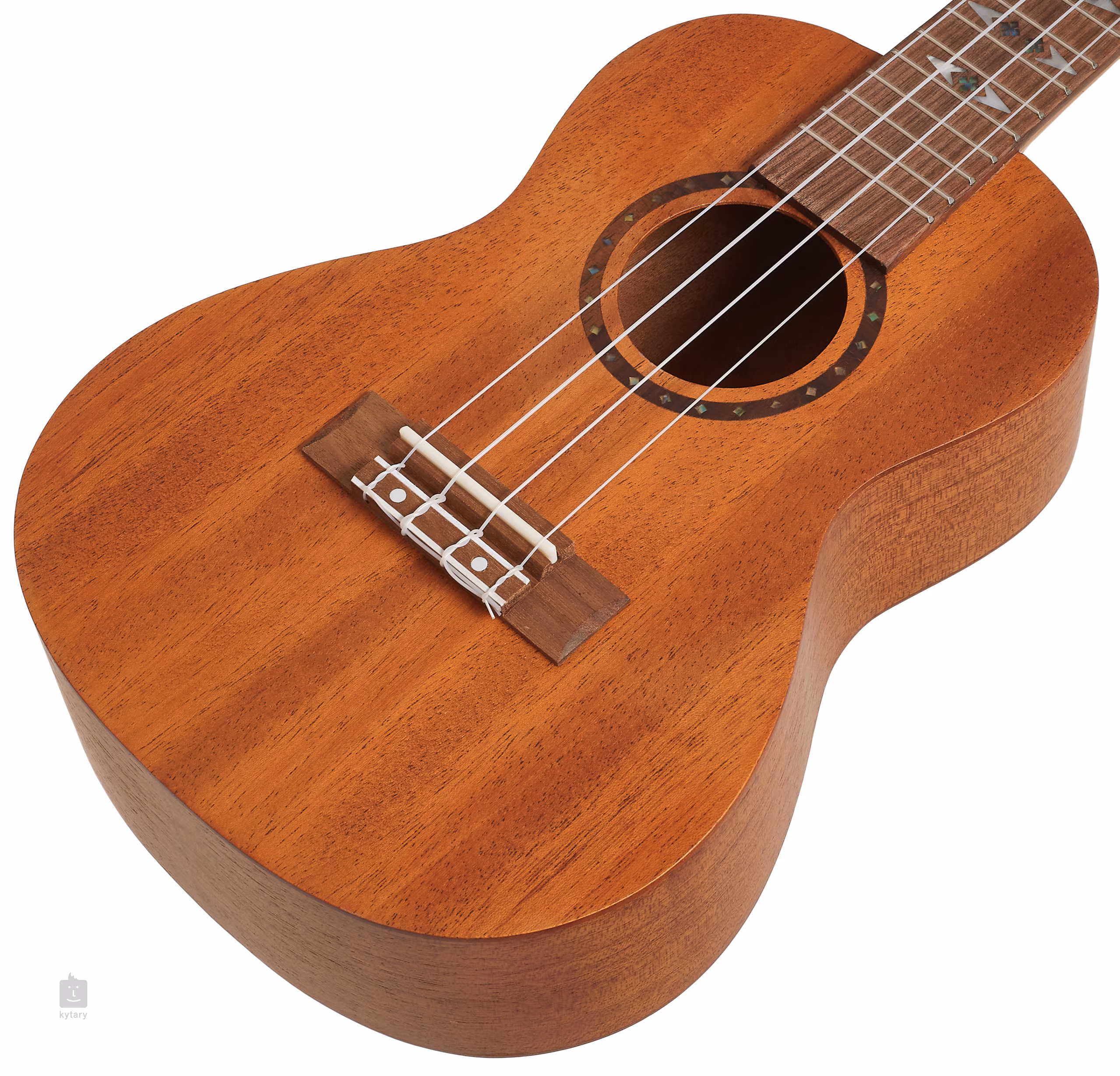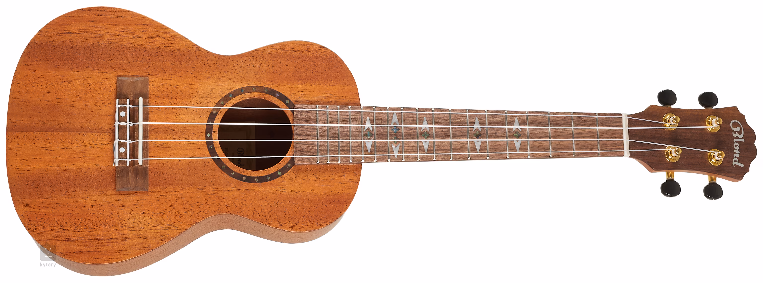 Tělo akustického ukulele Blond BLO-032-24 velikosti Concert je zhotoveno z mahagonu - přední deska z masivu, zadní deska a luby z laminovaného mahagonu. Hmatník z černého ořechu je osazen osmnácti pražci, ze stejného materiálu je i kobylka ukulele.