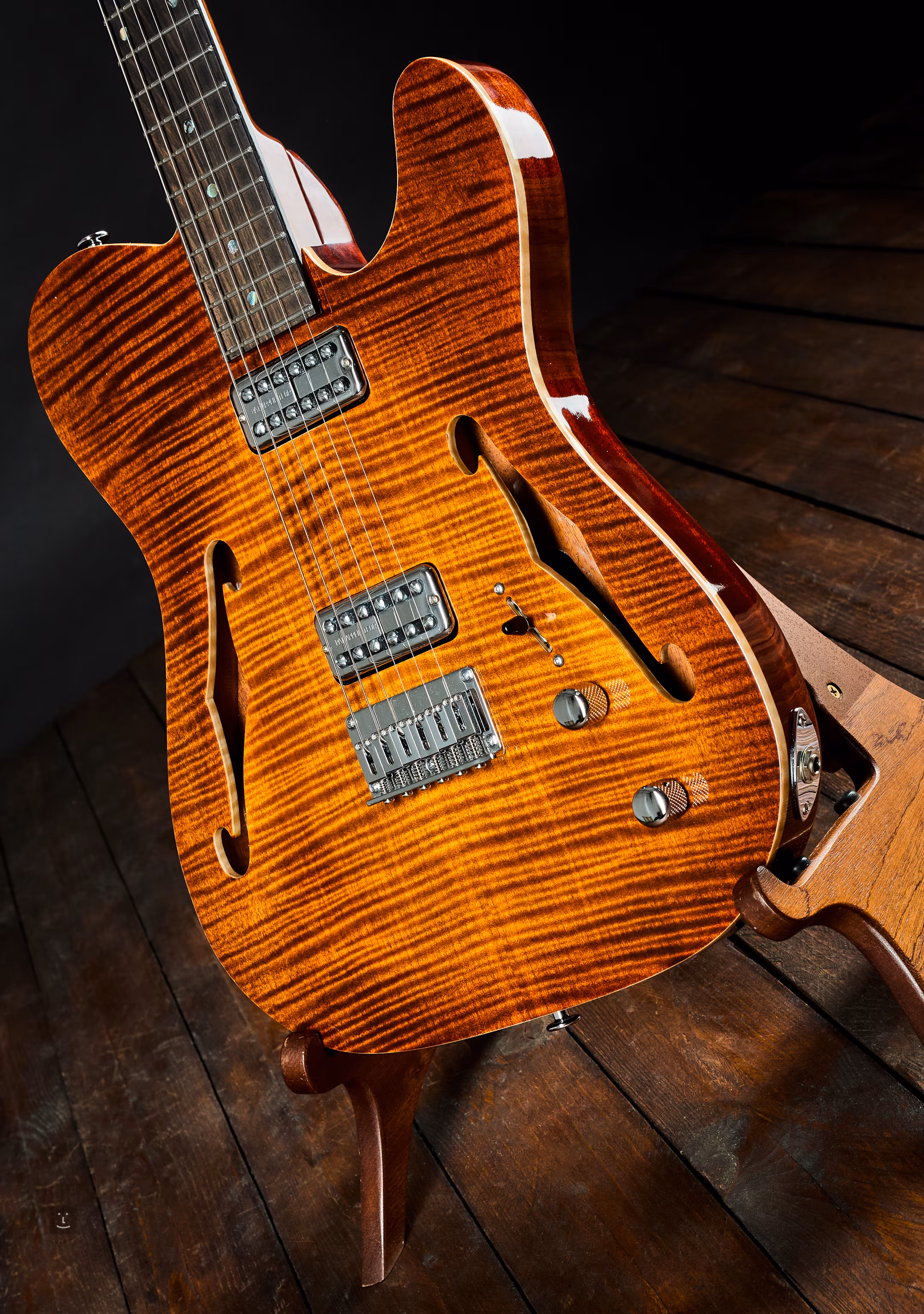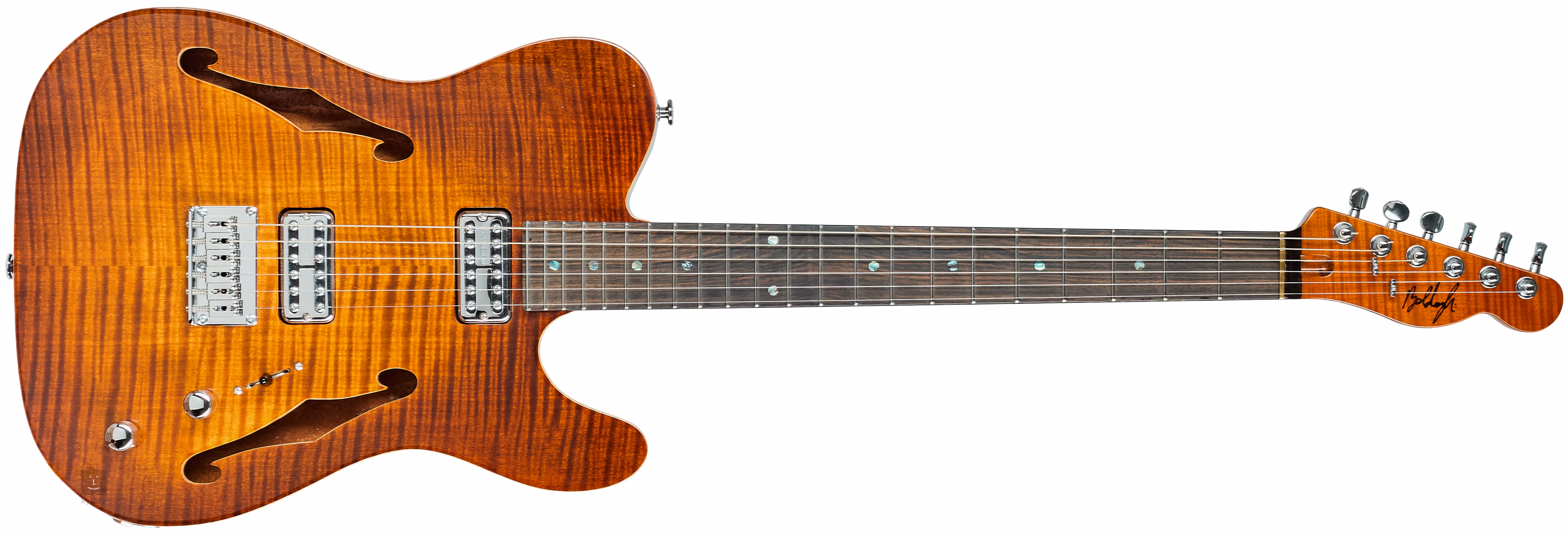 Ručně vyrobený thinline telecaster z výběrových dřev. Nástroj pochází z roku 2025 z dílny Csaby Boldogha, současného maďarského kytaráře. Je prakticky pouze vyzkoušený, jako nový.