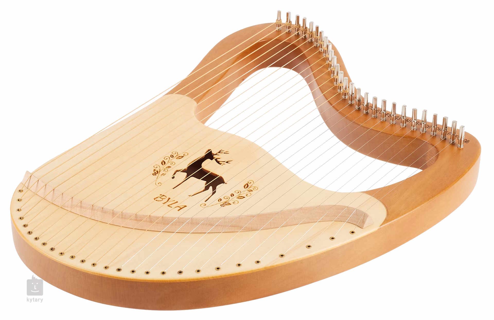 Lyra LH27T je v přírodní barvě, má dvacet sedm strun a je zdobena řezbou okolo ozvučného otvoru ve tvaru jelena.
