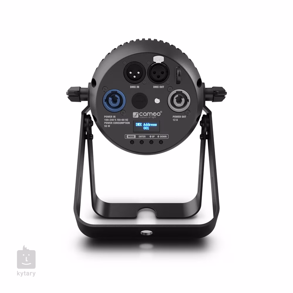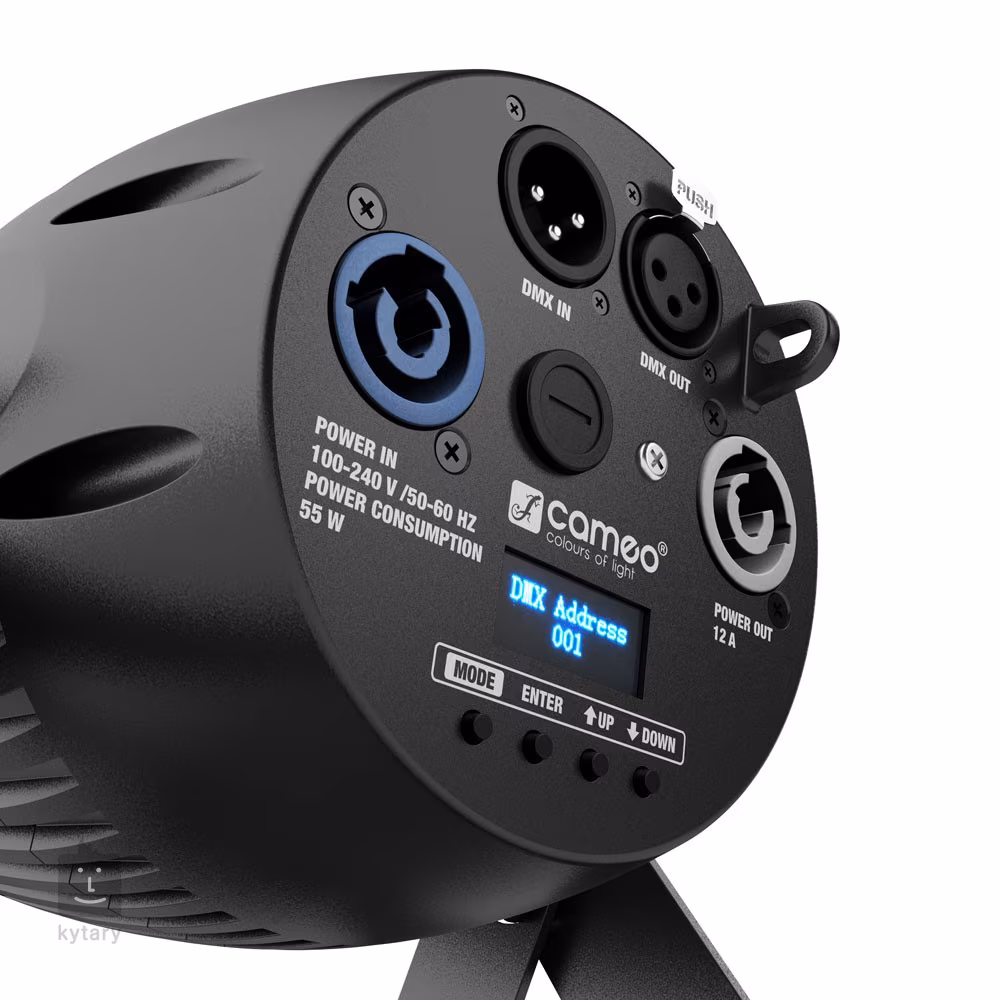 Zařízení lze ovládat prostřednictvím protokolu DMX nebo RDM. Dále můžete využít ovládání s pomocí Master/Slave, standalone nebo zvukové ovládání prostřednictvím integrovaného mikrofonu. Zadní panel nabízí 3pinové DMX In/Out konektory a napájecí konektory PowerCon In/Out pro napájení a daisychain připojení. Dále zde naleznete přehledný OLED displej a čtyřtlačítkový ovládací panel. Zařízení má základní IP krytí IP20, takže je vhodné pouze pro použití ve vnitřních prostorách. K reflektoru lze dokoupit dálkový IR ovladač.