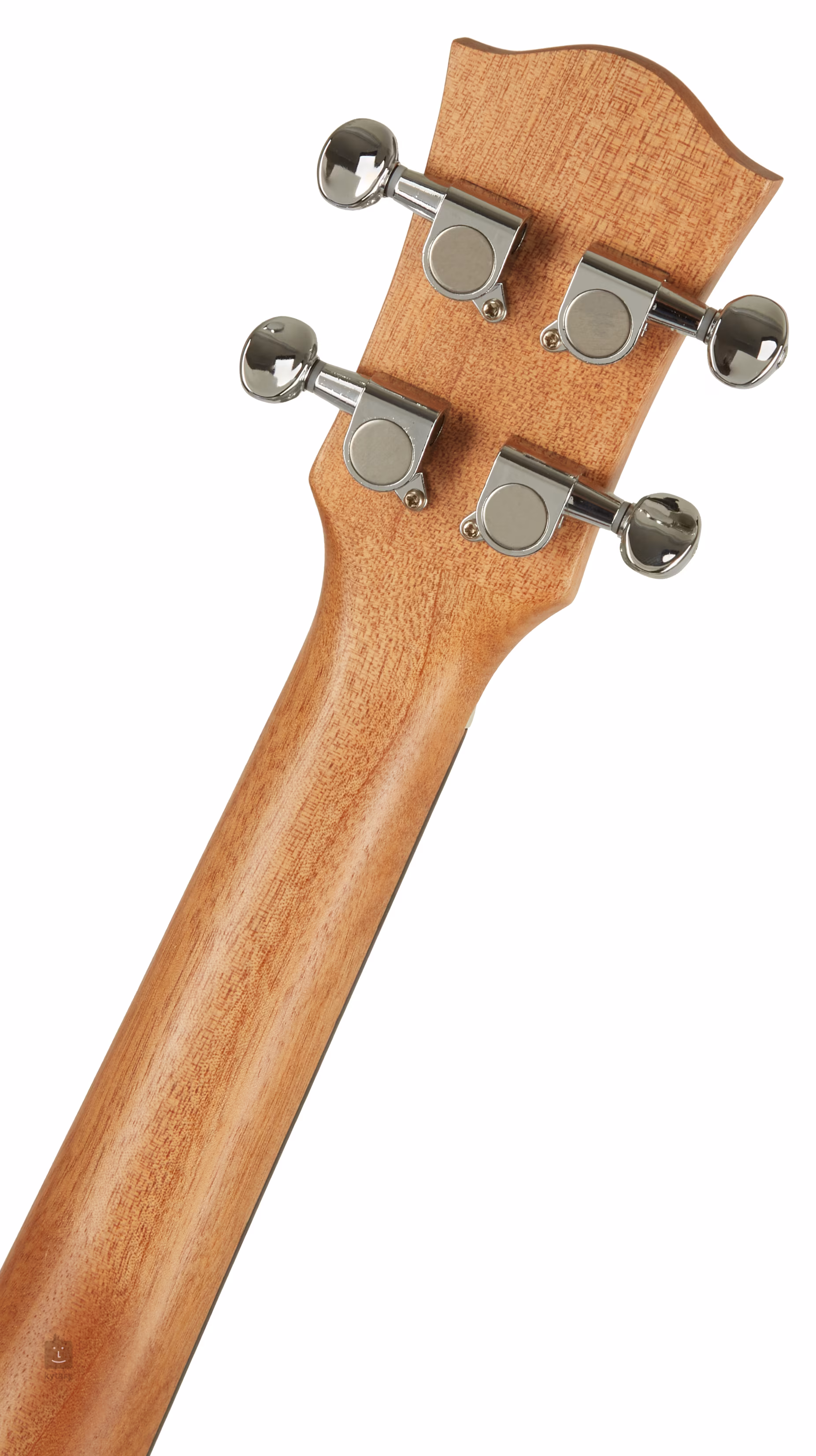 Struny jsou uchyceny v chromovaných mechanikách kytarového typu a palisandrové kobylce. Pěkné zpracování podtrhuje rozeta a výložka se vzorem rybí kosti a černá oboustranná obvodová lemovka těla. Ukulele je dodáváno v polstrovaném obalu (tloušťka polstrování 5 mm) spolu se třemi trsátky.
