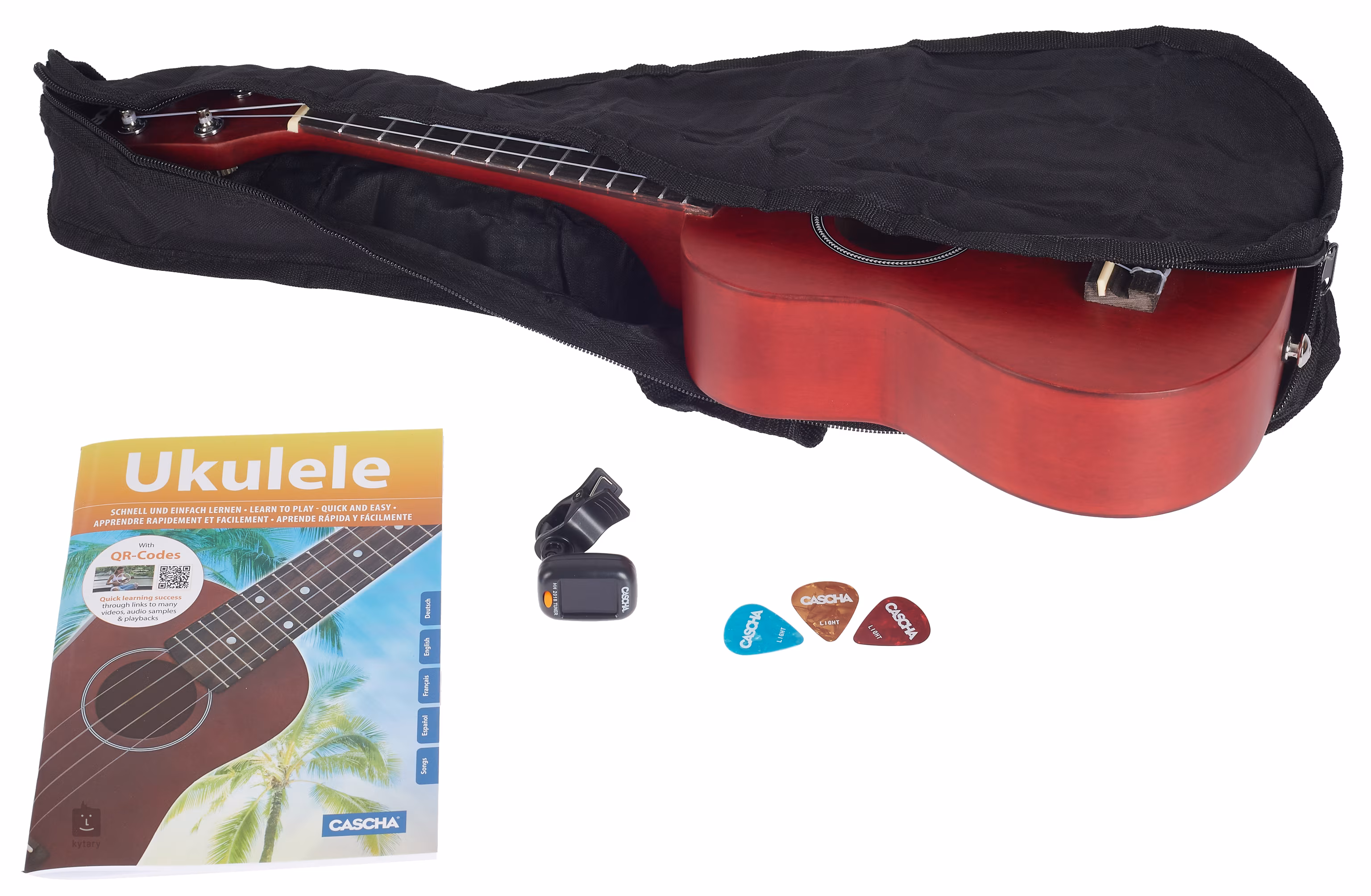 Sopránové ukulele Cascha Red je cenově dostupný nástroj vhodný pro děti a úplné začátečníky. V rámci tohoto starter packu spolu s ukulele získáte praktický obal, tři trsátka, školu hry na ukulele v anglickém jazyce a klipovou ladičku (k napájení ladičky je zapotřebí lithiová baterie CR2032).