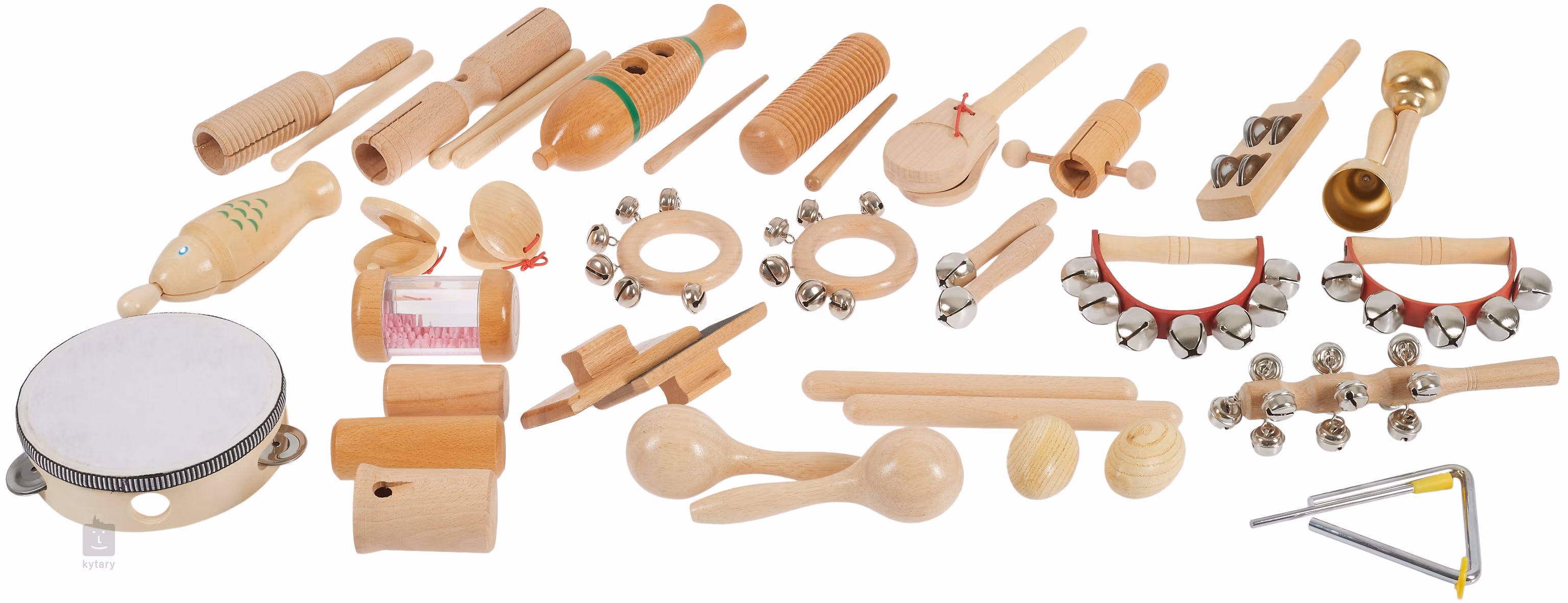 Všechny nástroje v sadě jsou vyrobeny z prémiových materiálů, které zajišťují odolnost, bezpečné použití a příjemný zvukový projev. Sada obsahuje širokou škálu nástrojů od tamburín, přes různé druhy ozvučných dřívek, zvonků, klapaček až po klasický triangl.