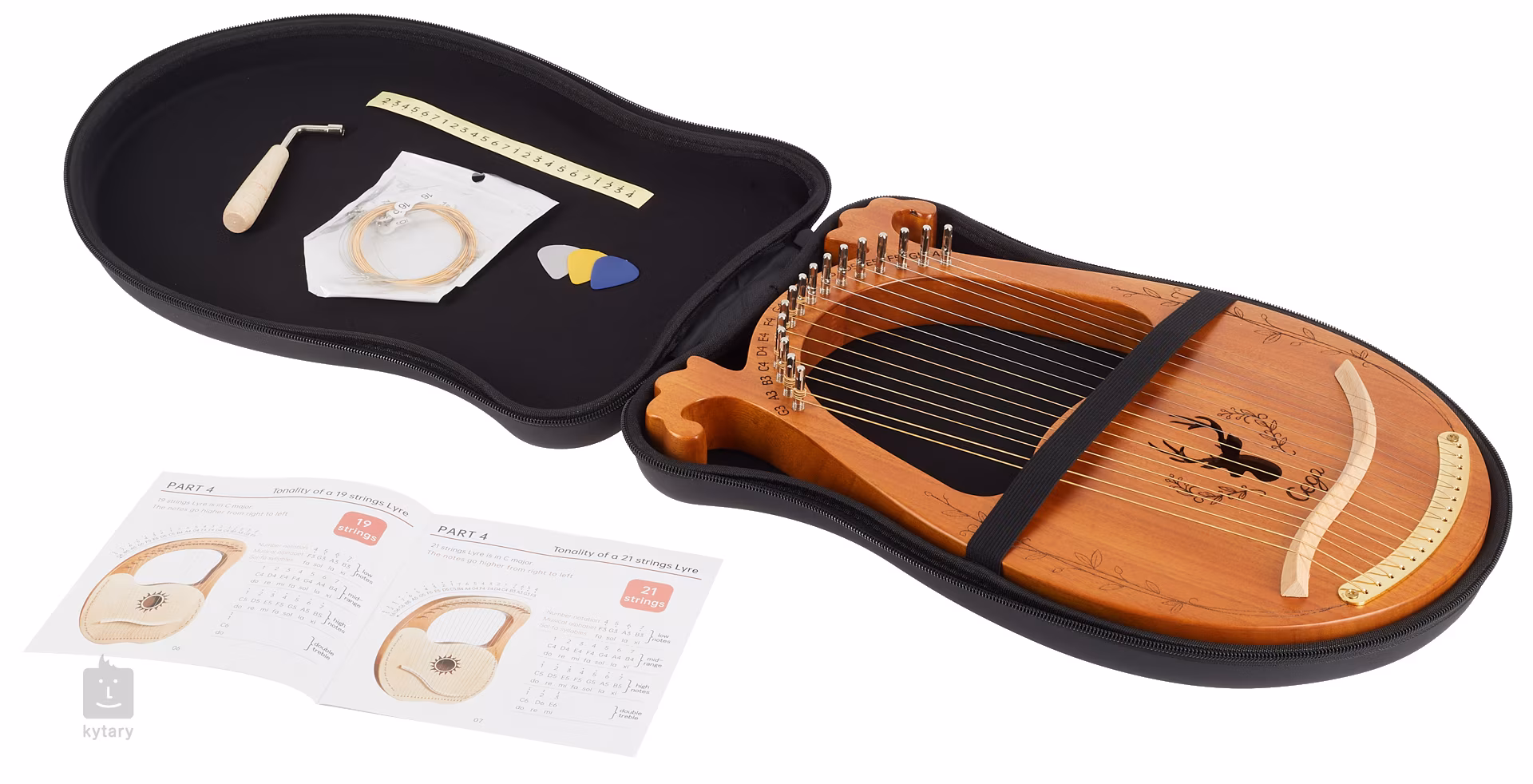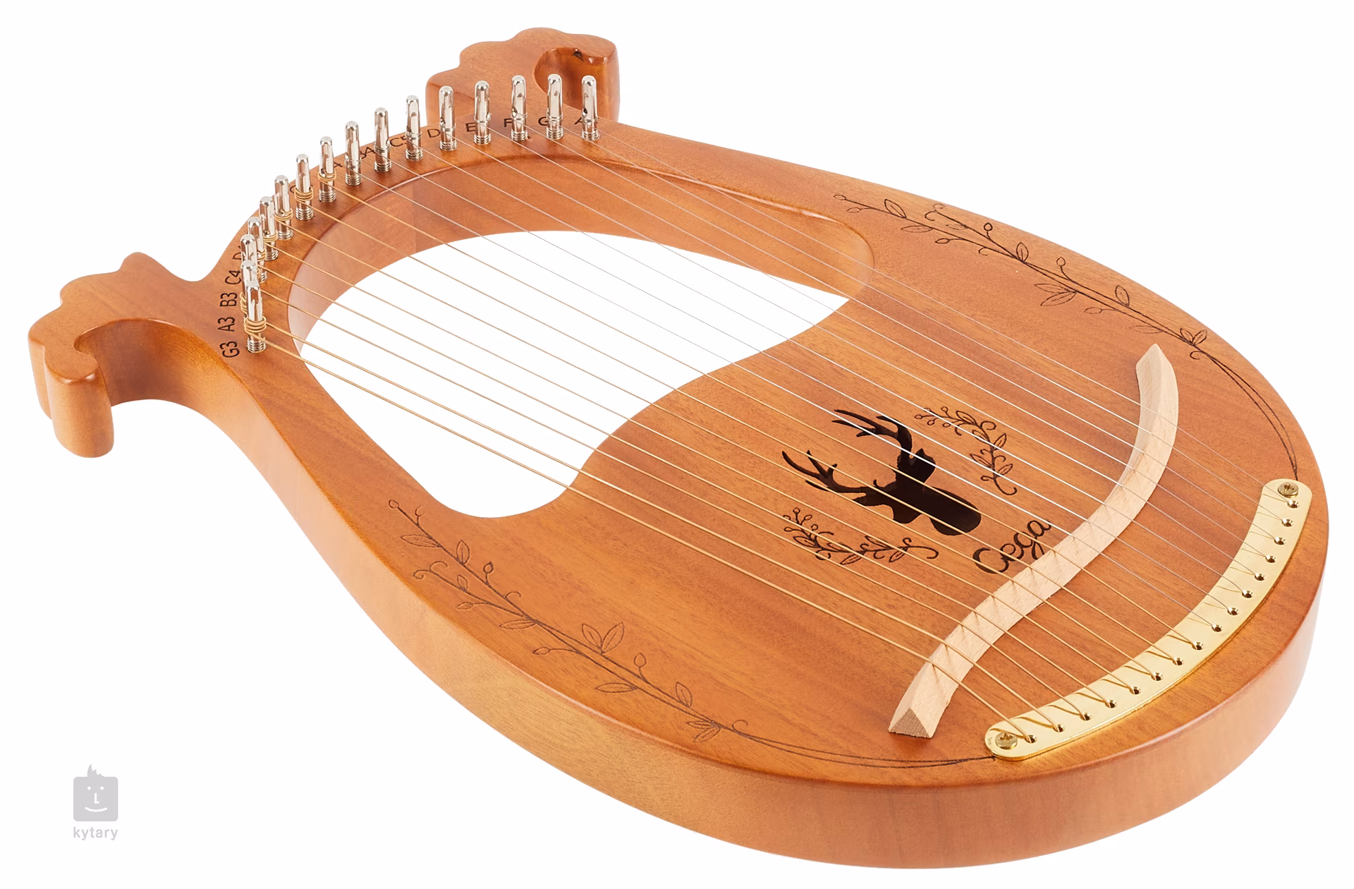 Lyra LH16W-T je v barvě přírodního dřeva, má šestnáct strun a je zdobena řezbou okolo ozvučného otvoru ve tvaru jelena.
