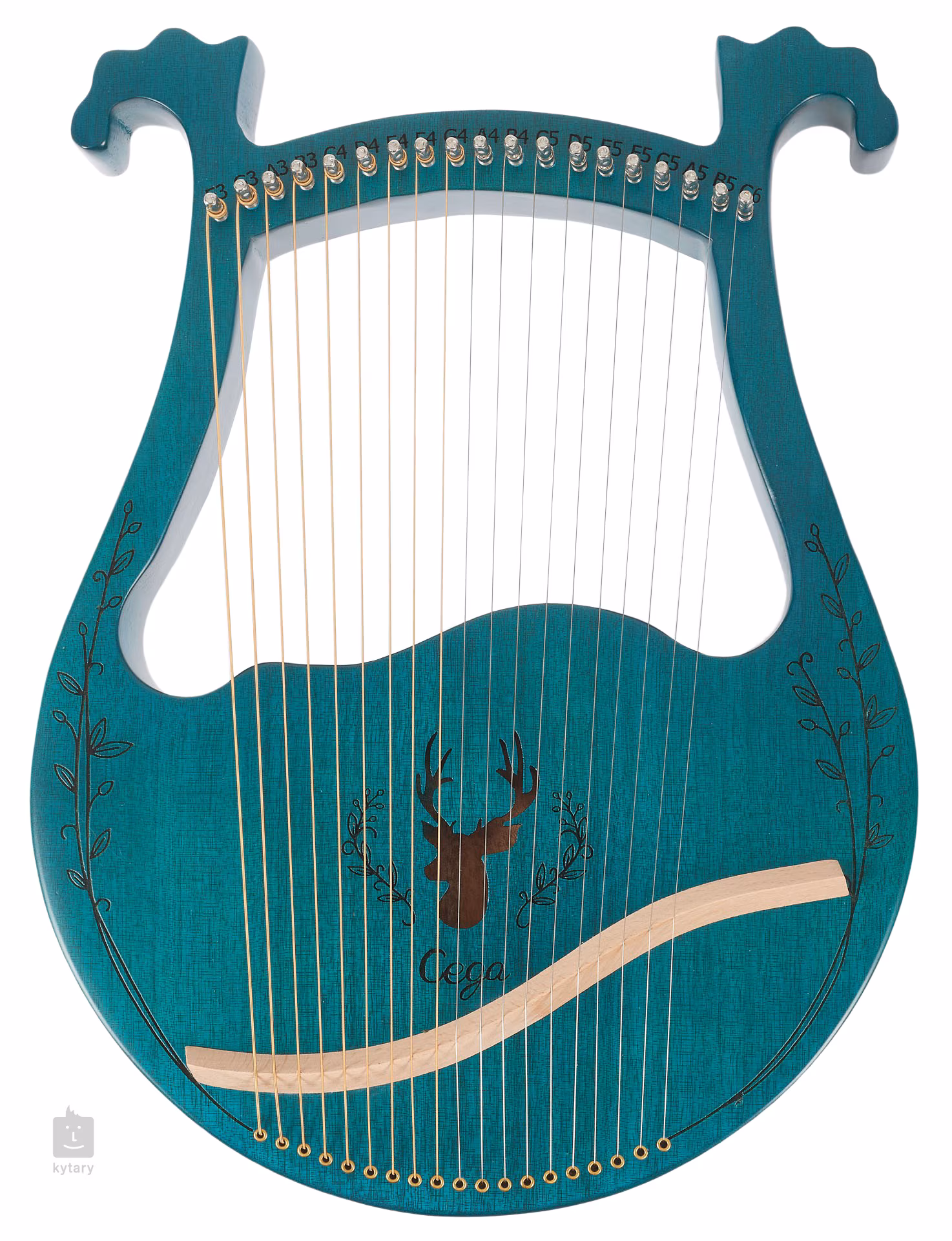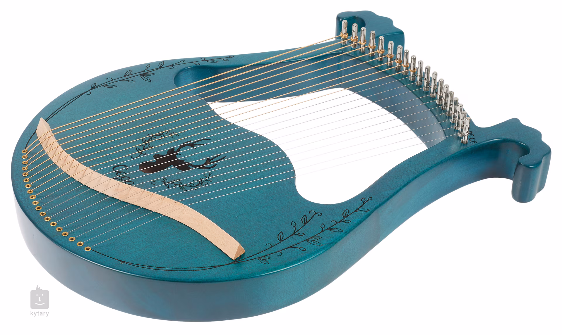 Harfa LH19B-T je v modré barvě, má devatenáct strun a je zdobena řezbou okolo ozvučného otvoru ve tvaru jelena.