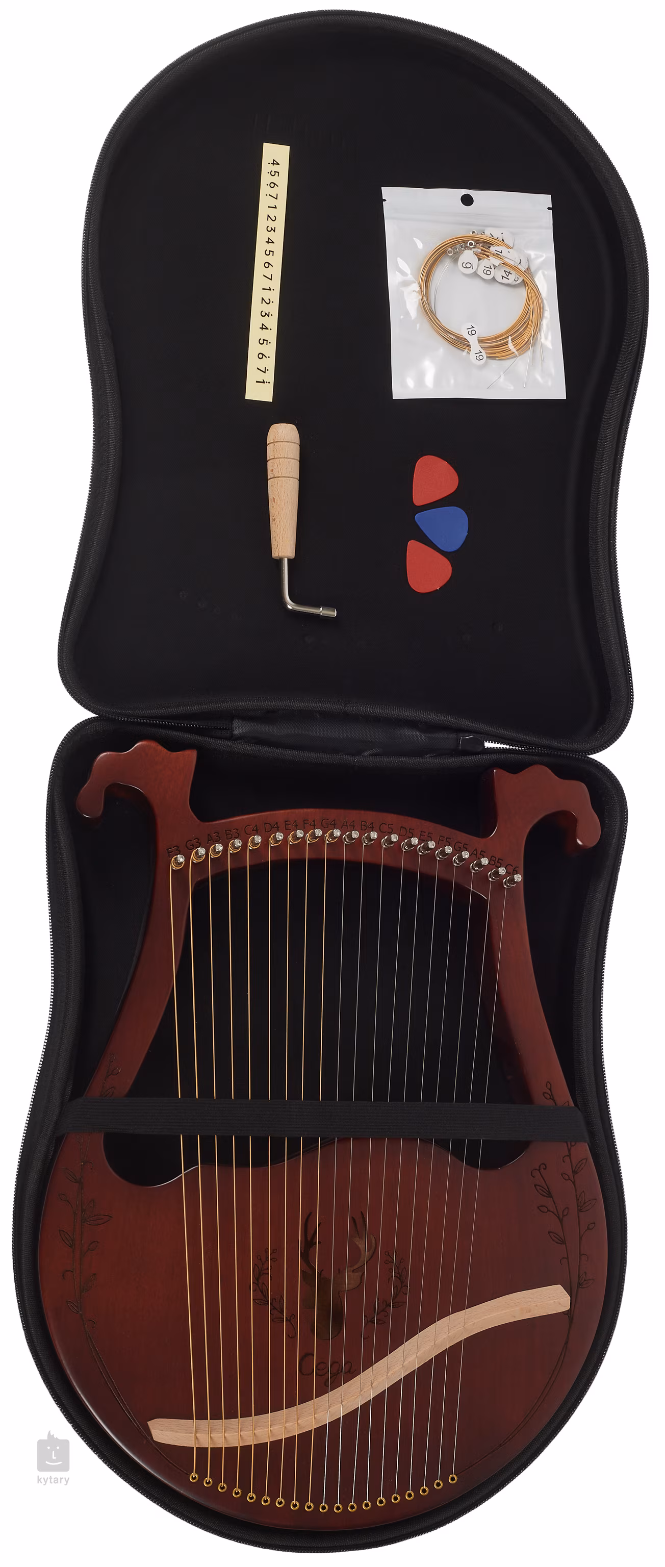 Harfa LH19C-T je v kávové barvě, má devatenáct strun a je zdobena řezbou okolo ozvučného otvoru ve tvaru jelena.