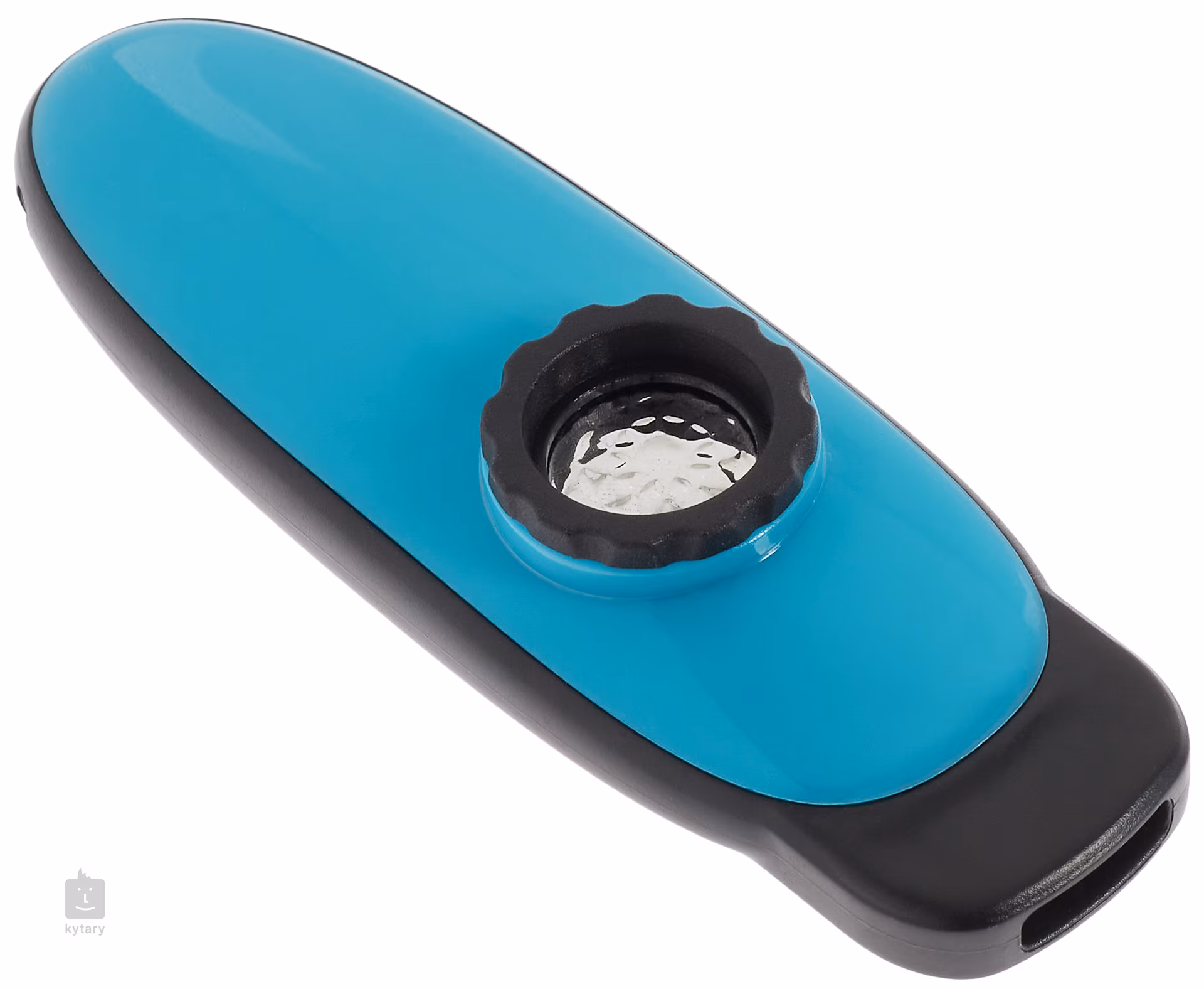 Klasické plastové kazoo. Otáčením krytu lze nastavit pnutí membrány a měnit tak zvukovou odezvu kazoo.