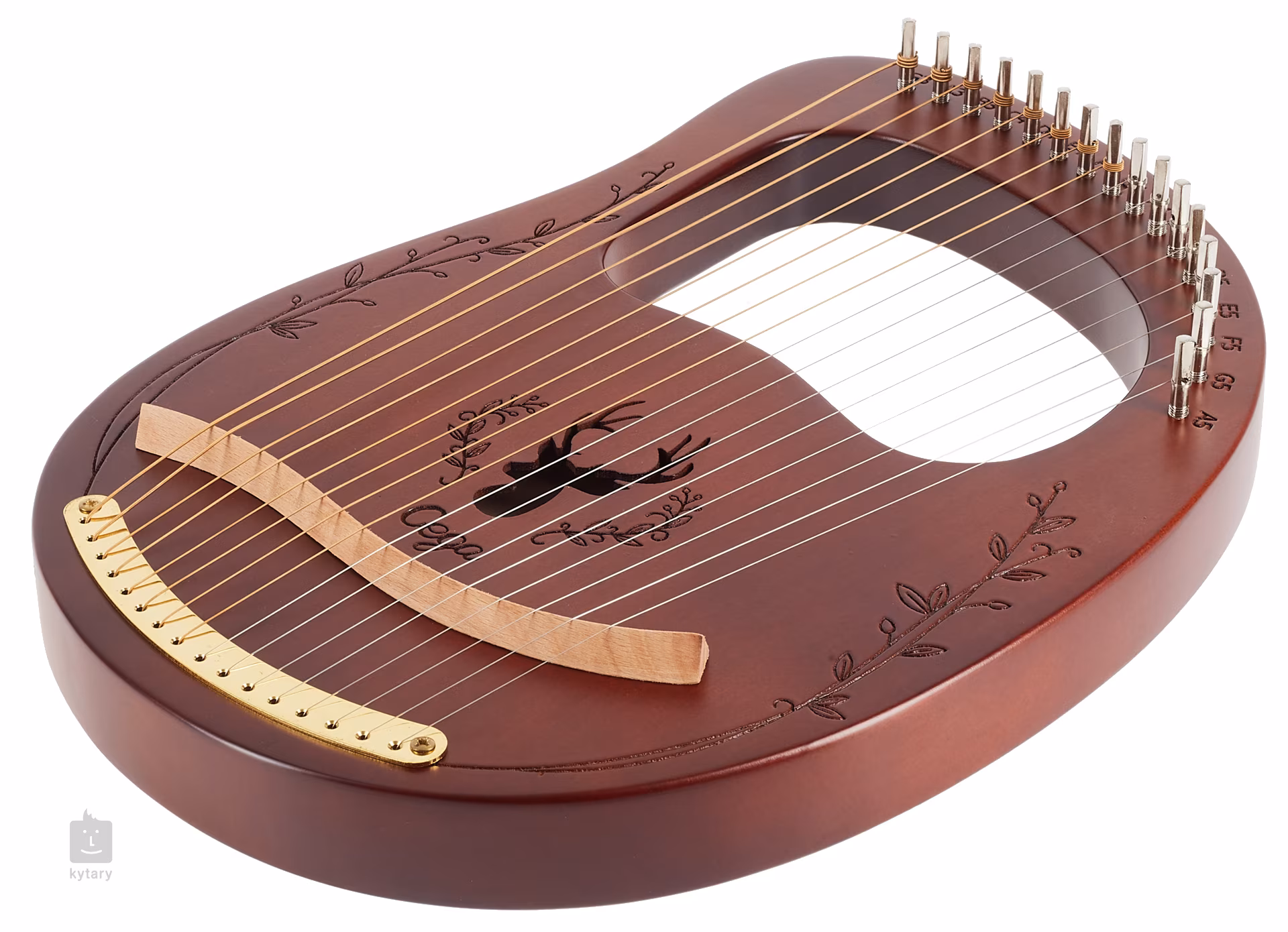 Lyra LH16C-T je v kávové barvě, má šestnáct strun a je zdobena řezbou okolo ozvučného otvoru ve tvaru jelena.