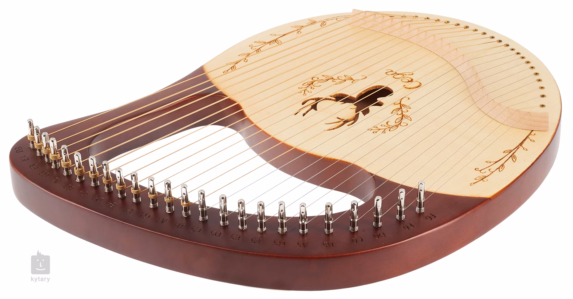 Lyra LH24C je kávové barvě, má dvacet čtyři strun a je zdobena řezbou okolo ozvučného otvoru ve tvaru jelena.