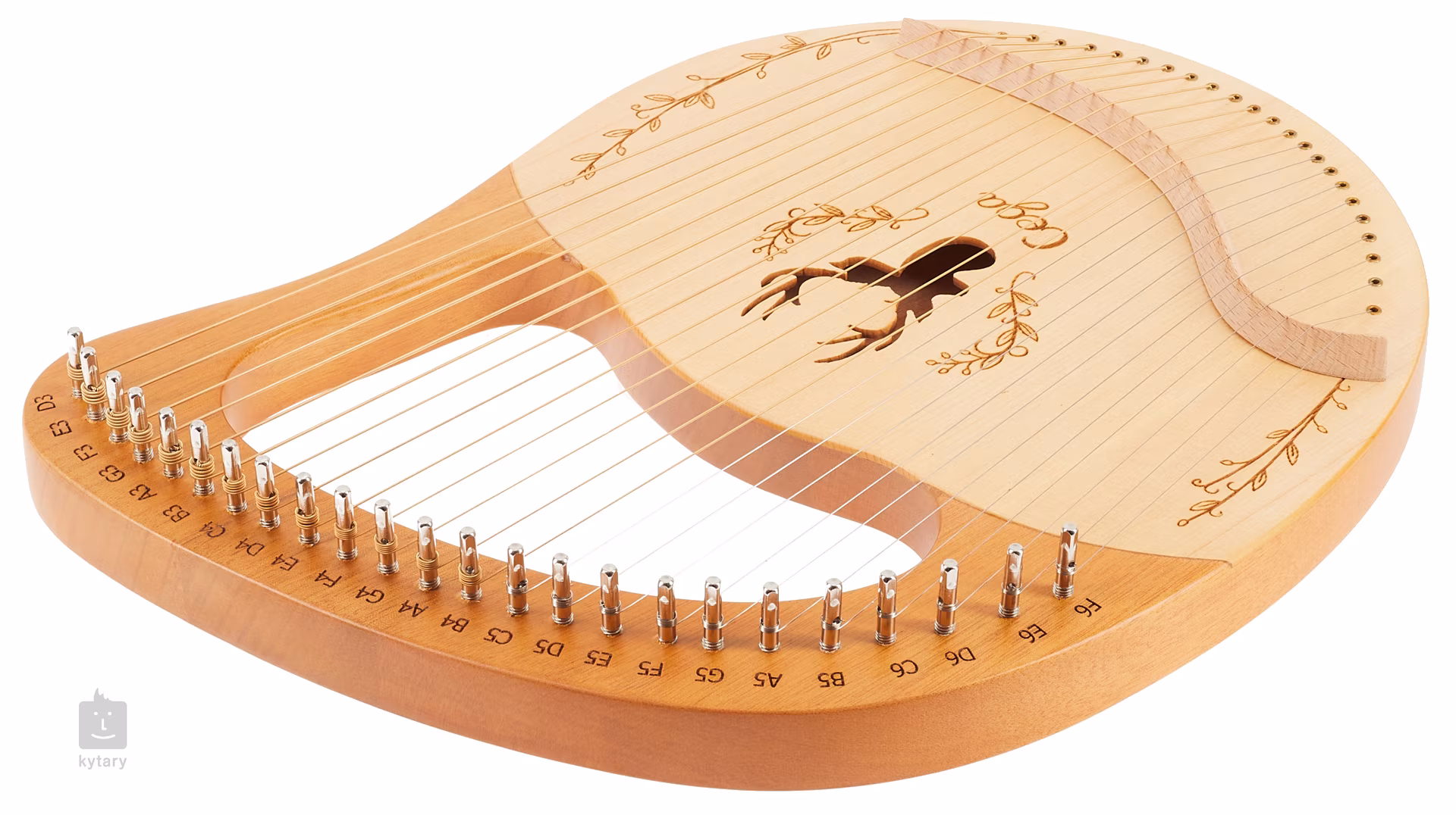 Lyra LH24W je v přírodní barvě, má dvacet čtyři strun a je zdobena řezbou okolo ozvučného otvoru ve tvaru jelena.