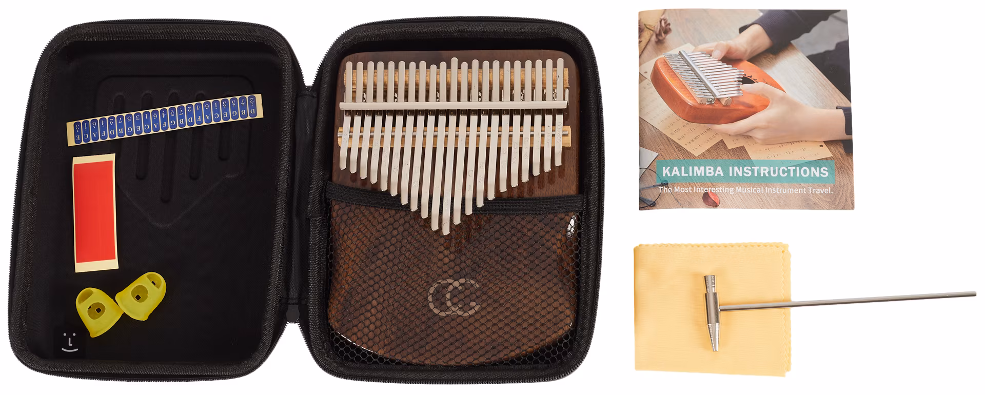 Součástí balení je kromě samotného nástroje také manuál, který vás srozumitelně seznámí s nástrojem a se základní technikou hry, dále pak dva prstýnky, ladící kladívko, čistící hadřík, samolepky na klávesy a cestovní pouzdro.