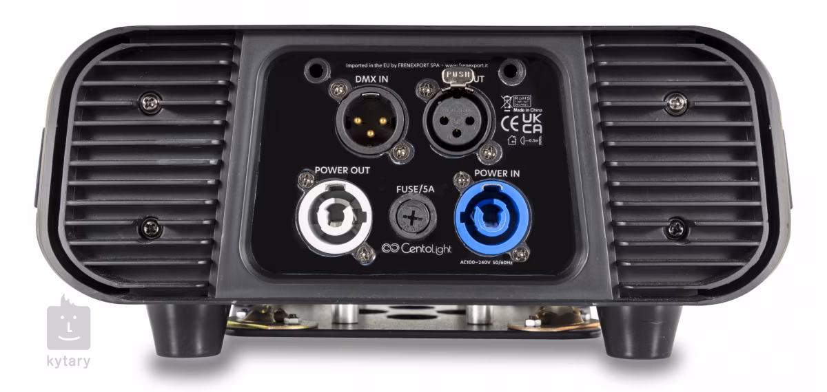 Součástí balení je kromě samotné otočné hlavy také napájecí kabel, DMX kabel, bezpečnostní kabel a dva háky pro upevnění.