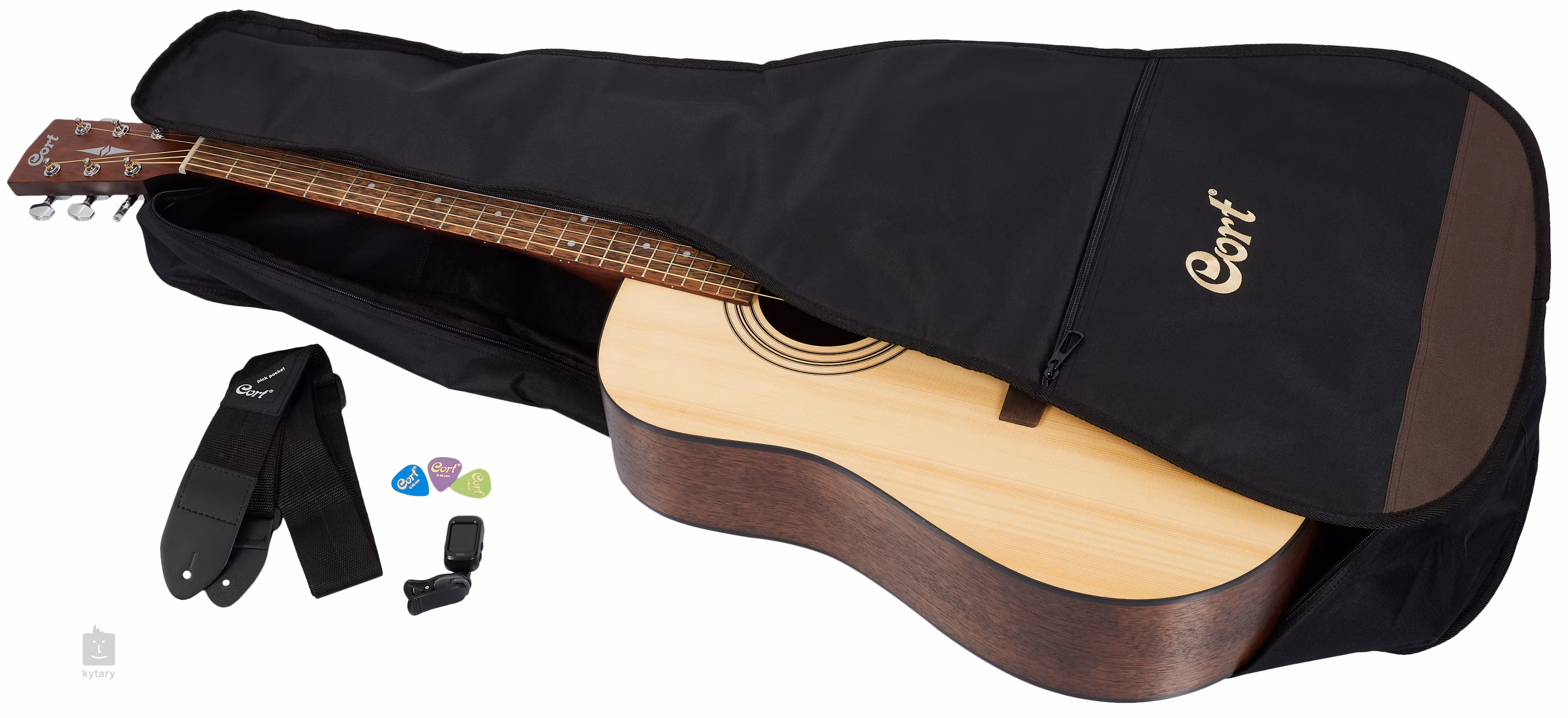 Součástí kytarového setu Earth Pack OP je akustická kytara Cort Earth 60, obal (gig bag), klipové ladička E200C, kytarový popruh a trsátka.