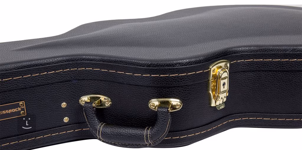 Vnitřní část kufru disponuje měkkou plyšovou podšívkou a bohatým polstrováním, které vytváří dokonale bezpečné prostředí, které kytaru chrání před nárazy i poškrábáním. Pro uložení příslušenství slouží velká vnitřní přihrádka, do níž bezpečně uložíte ladičku, struny, kapodastr a další nezbytnosti. Snadné přenášení zajišťuje měkké madlo potažené kůží, které je příjemné do ruky. Luxusní design kufru podtrhuje elegantní zlaté kování, což z něj činí nejen praktický, ale i estetický doplněk pro bezpečný transport kytary.