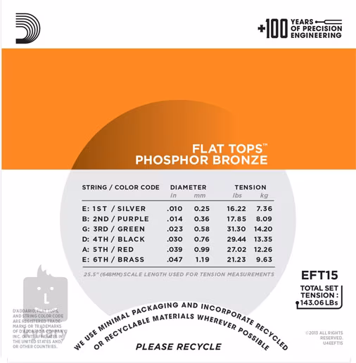 Struny D'Addario Flat Tops vynikají svým hlazeným povrchem, díky němuž jsou při hraní tišší, čehož využijete zejména při nahrávání, kde je každý nežádoucí hluk slyšet. Zvukově se jedná o vřelé struny s frekvenčně vyváženým tónem. Jejich jádro je z tradiční oceli s vysokým obsahem uhlíku, zatímco vinutí je vyrobeno z fosforbronzu.