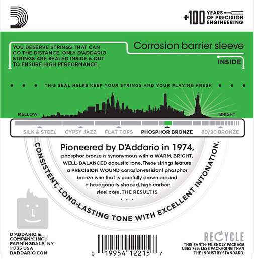 Pokud hledáte struny pro akustickou kytaru se zakulaceným, vřelým zvukem, řada D'Addario Phosphor Bronze pro vás bude tou správnou volbou. Fosforbronz se v dnešní době k výrobě strun používá běžně, ale v roce 1974 to byla právě společnost D'Addario, která tento materiál předvedla úplně poprvé. Od té doby jsou synonymem pro teplý, frekvenčně vyvážený tón, který je vhodný pro všechny možné žánry. Šestihranné ocelové jádro s vysokým obsahem uhlíku jim dodává dlouhou životnost, excelentní intonaci a nádherný tón. V tomto balení najdete struny s tvrdostí 14–59, které nabízí velmi silnou zvučnost a průraznost.
