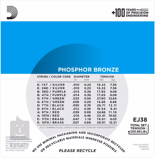Pokud hledáte struny pro akustickou kytaru se zakulaceným, vřelým zvukem, řada D'Addario Phosphor Bronze pro vás bude tou správnou volbou. Fosforbronz se v dnešní době k výrobě strun používá běžně, ale v roce 1974 to byla právě společnost D'Addario, která tento materiál předvedla úplně poprvé. Od té doby jsou synonymem pro teplý, frekvenčně vyvážený tón, který je vhodný pro všechny možné žánry. Šestihranné ocelové jádro s vysokým obsahem uhlíku jim dodává dlouhou životnost, excelentní intonaci a nádherný tón. V tomto balení najdete struny pro dvanáctistrunnou kytaru tvrdosti 10.