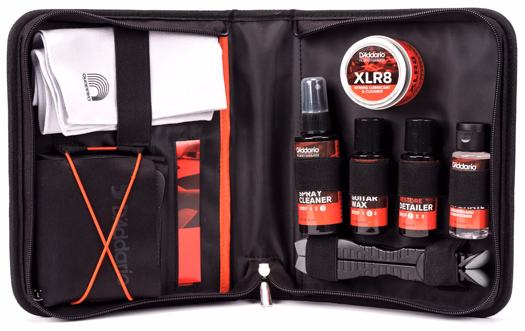 Toto pouzdro obsahuje vše, co budete opravdu potřebovat při péči o vaši kytaru nebo baskytaru. Uvnitř naleznete tři prostředky k čištění/leštění lakovaných povrchů (Shine, Restore, Protect), čistič hmatníku Hydrate, čistič pražců, čistič a lubrikant strun XLR8, hadřík z mikrovláken, pracovní podložku pro kytaru a držák krku.