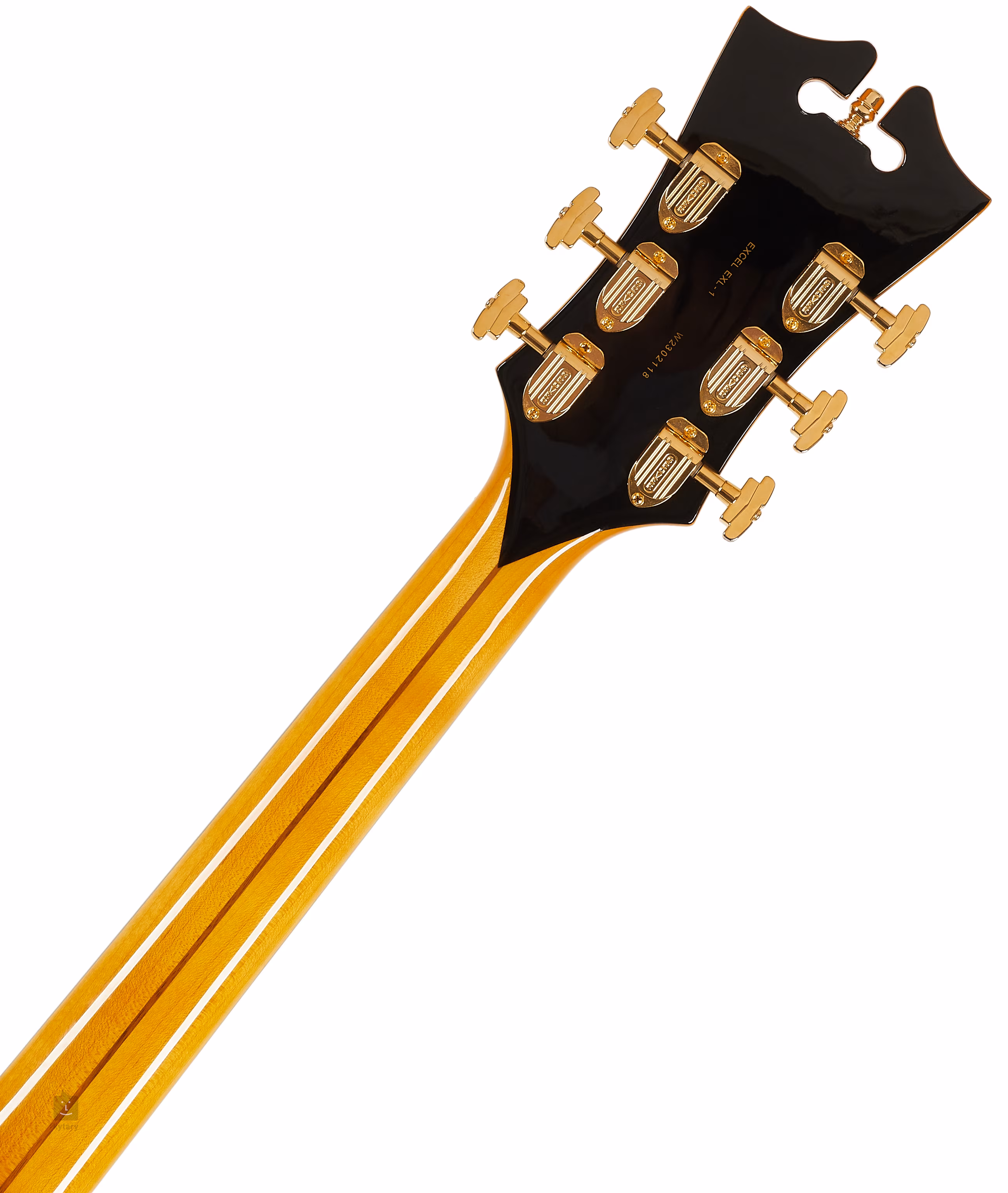 Tělo kytary vyvažuje pro tuto firmu typická hlavice ozdobená perleťovým firemním a Excel Shield logem (Mother-of-Pearl). Stabilní ladění a dobrý sustain zaručuje uchycení strun přes nultý pražec z materiálu Graphtech NuBone XL v mechanikách Grover 150 Imperial a přes ebenovou kobylku ve struníku (D’Angelico Stairstep). Stylový vzhled kytary podtrhuje lemovka lemovka těla, hmatníku a hlavy, hardware ve zlatém provedení a pětivrstvý pickguard Scalini.