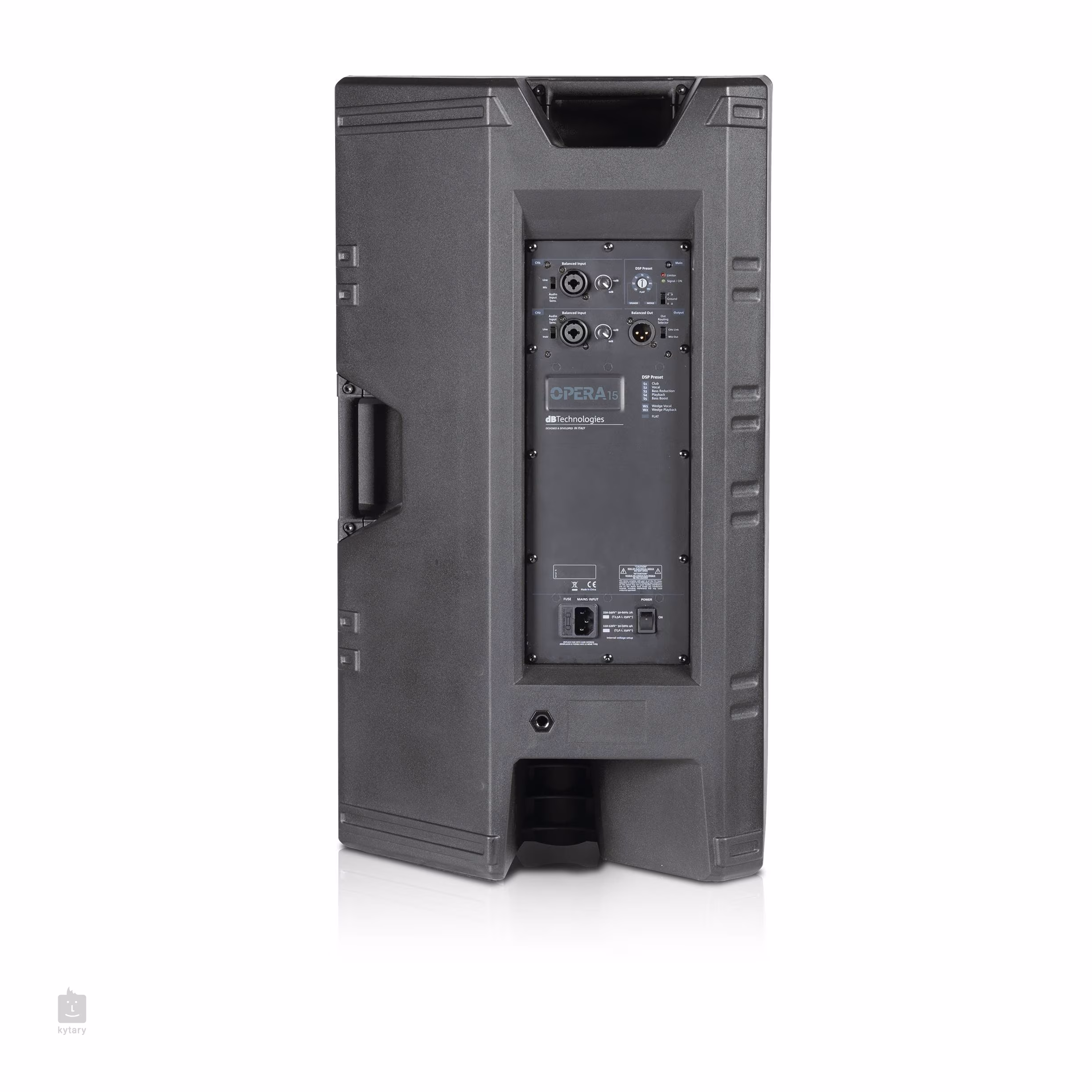 Uvnitř robustní konstrukce se nachází 15“ basový a 1“ výškový reproduktor, které vám spolu se zesilovačem třídy D nabídnou maximální výkon až 1200 W. Zadní strana nabízí přehledný ovládací panel, dva kombinované XLR/TRS vstupy a přepínač pro osm DSP presetů. Pár robustních madel vám zajistí pohodlný transport mezi produkcemi. Díky zkosenému tvaru můžete využít reprobox i jako odposlechový monitor.