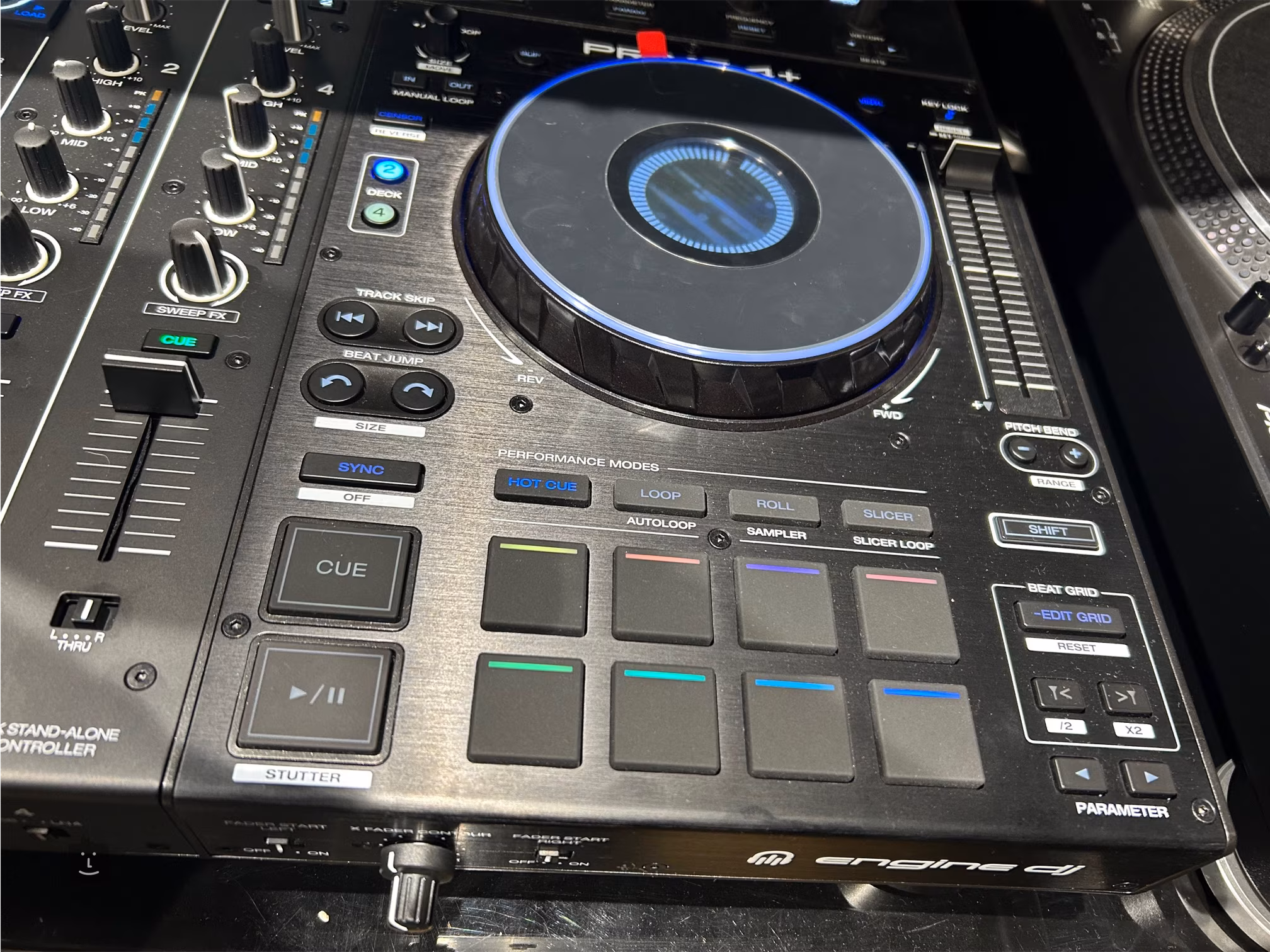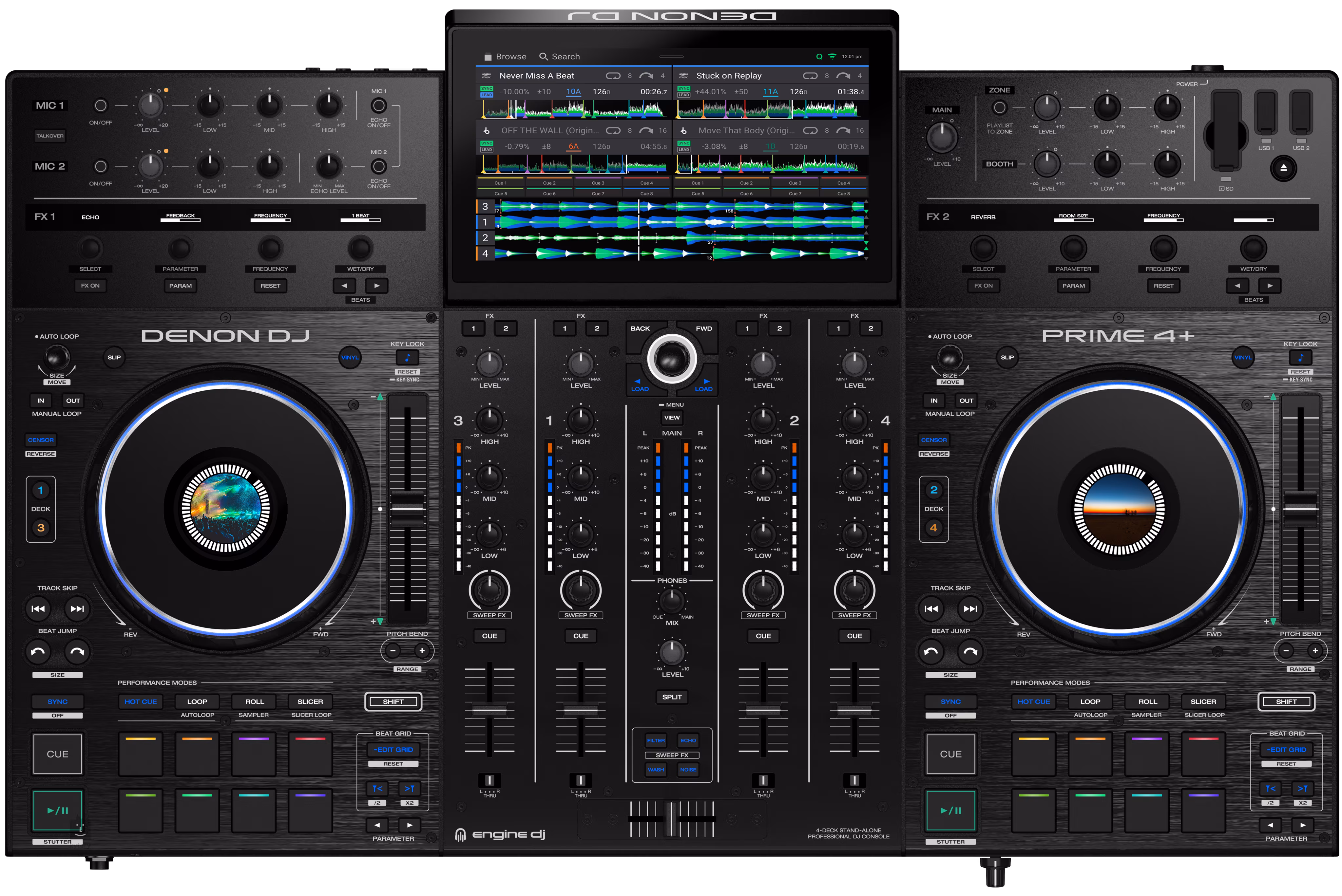 Prime 4+ disponuje vestavěným 10,1" dotykovým HD displejem, který umožňuje intuitivní ovládání a rychlý přístup ke všem funkcím a nastavením. Jeho ergonomický design a přehledné rozhraní umožňují snadné navigování skrz knihovnu skladeb, efekty, smyčky a další mixovací nástroje. Jog kolečka o průměru 6” jsou vybavena RGB podsvícením a středovými displeji. Dále je k dispozici také 16 RGB performance padů, které podporují různé režimy pro kreativní možnosti.