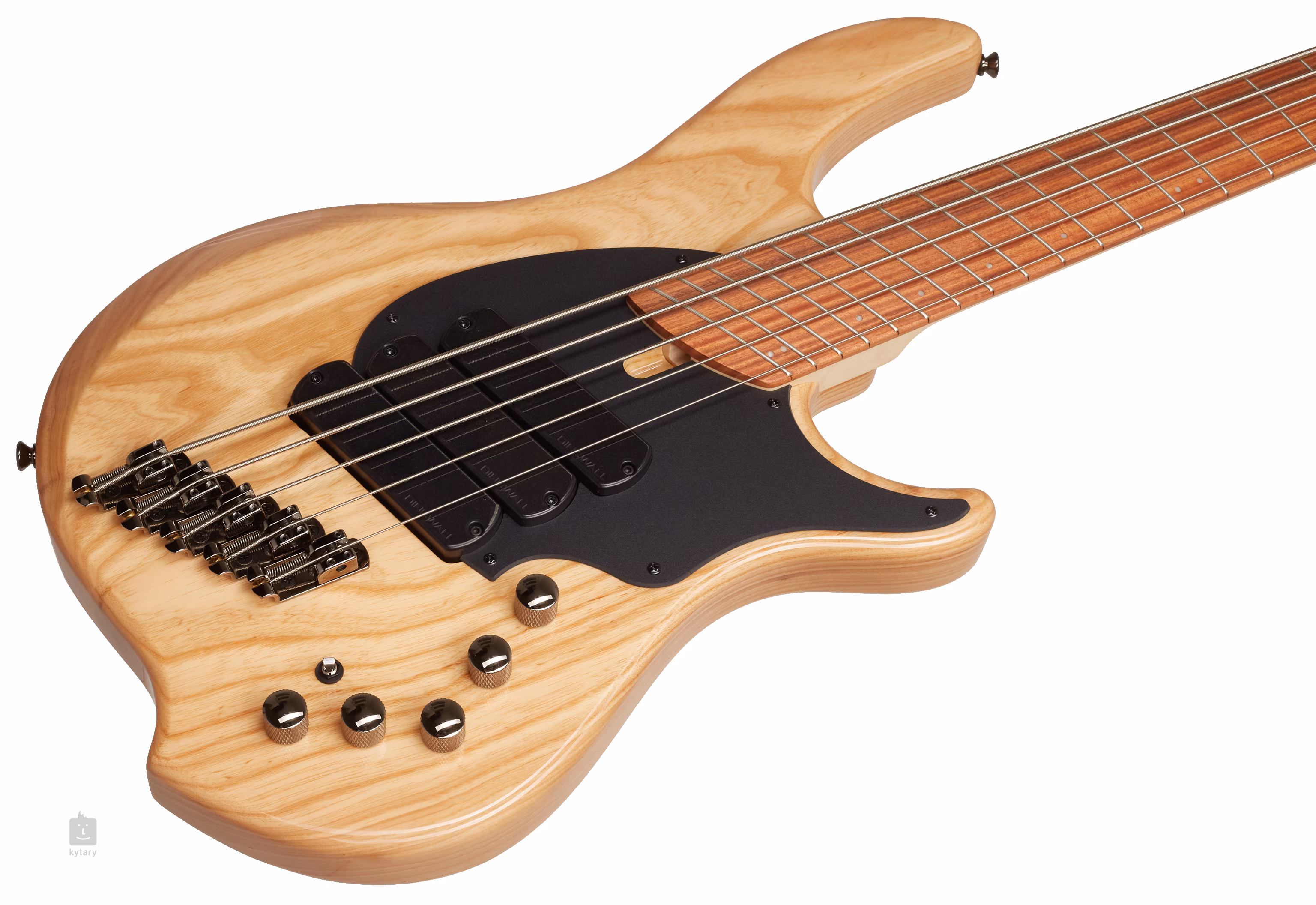 Pětistrunná baskytara značky Dingwall z řady Combustion v přirozeném barevném provedení Natural, jež dává vyniknout krásné kresbě jasanového dřeva.