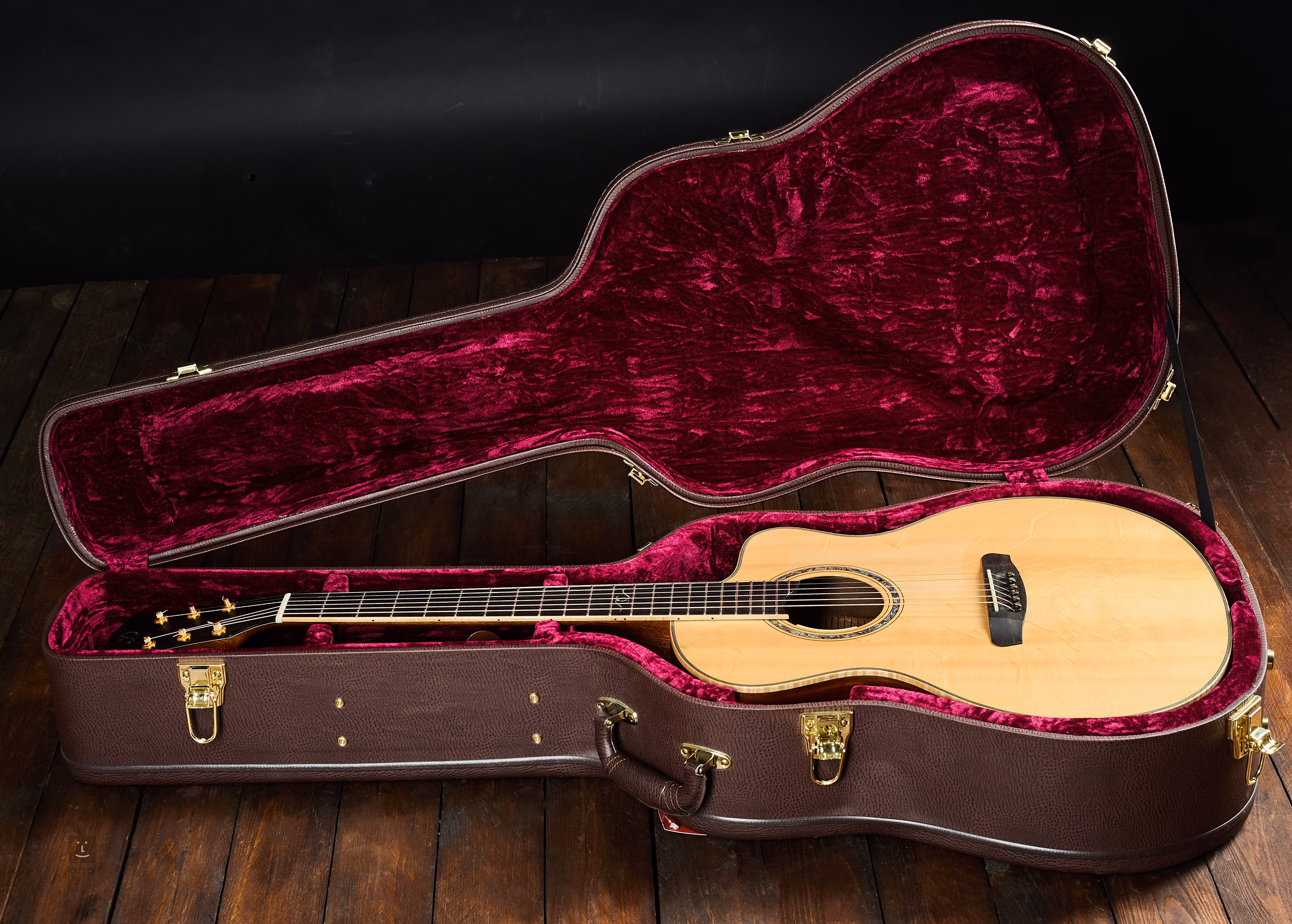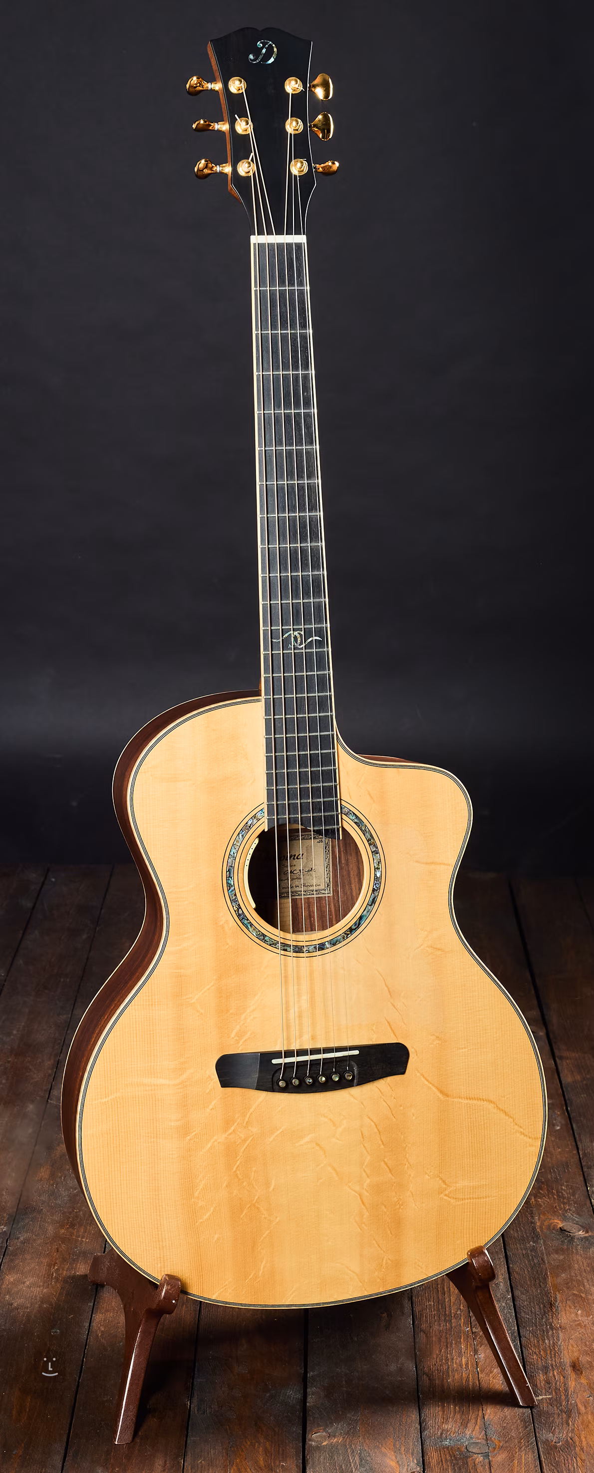 Přední deska smrk s fládrováním "bear claw". Zadní deska je ze 2 kusů cocobola (běžné provedení bývá pro vzácnost tohoto materiálu ze 3 kusů). Luby cocobolo. Nástroj je osazený ozvučovacím systémem L.R. Baggs Anthem.