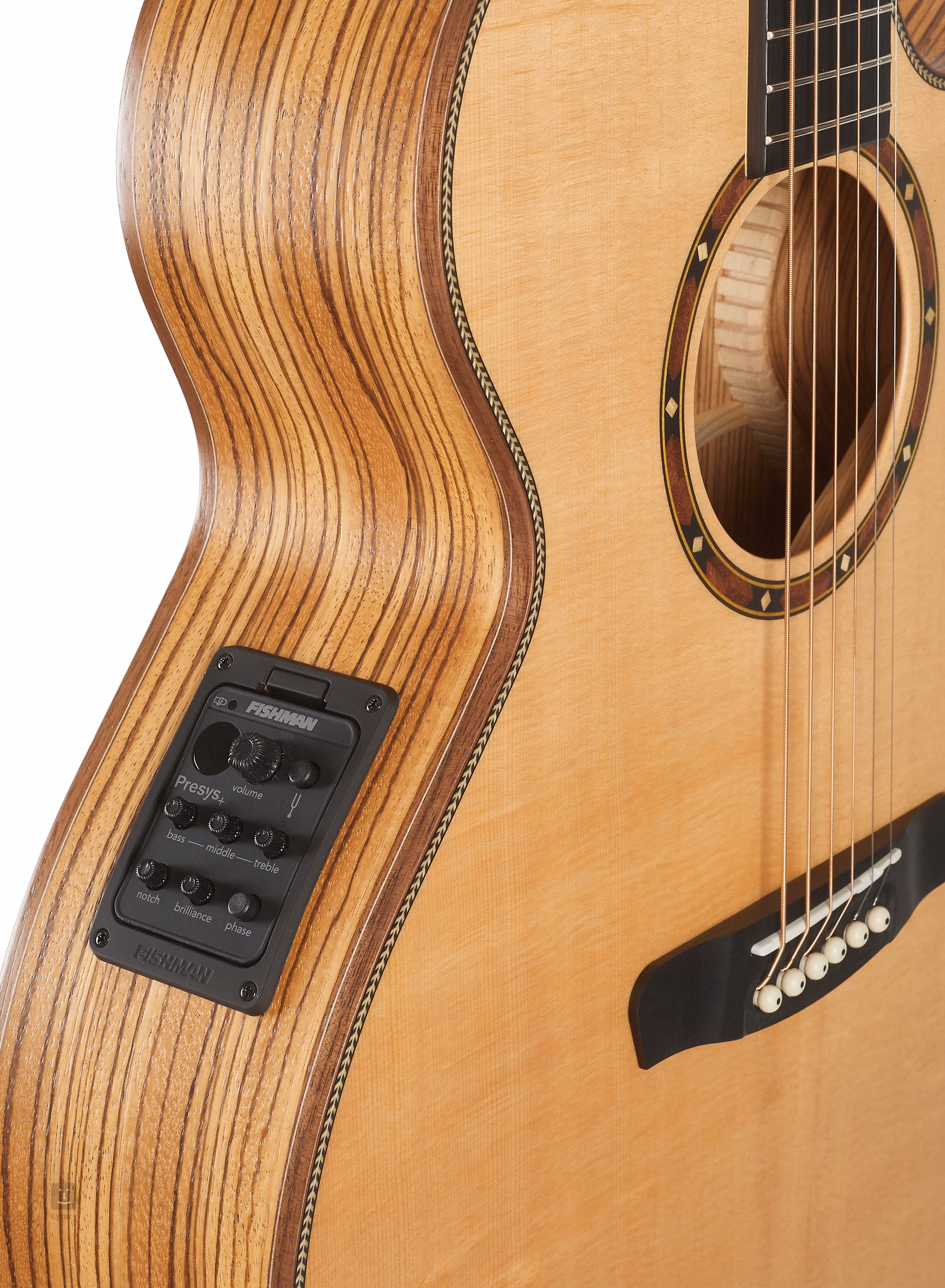 Základ kvalitního zvuku tvoří přední rezonanční deska z masivu kanadského smrku Sitka, ale z vizuálního hlediska je hlavní hvězdou vrstvené exotické zebrano na zadní desce a lubech. Dohmat na vyšších polohách hmatníku usnadňuje spodní výřez těla. Přirozený zvuk nástroje zvýrazňuje povrchová úprava s otevřenými póry.