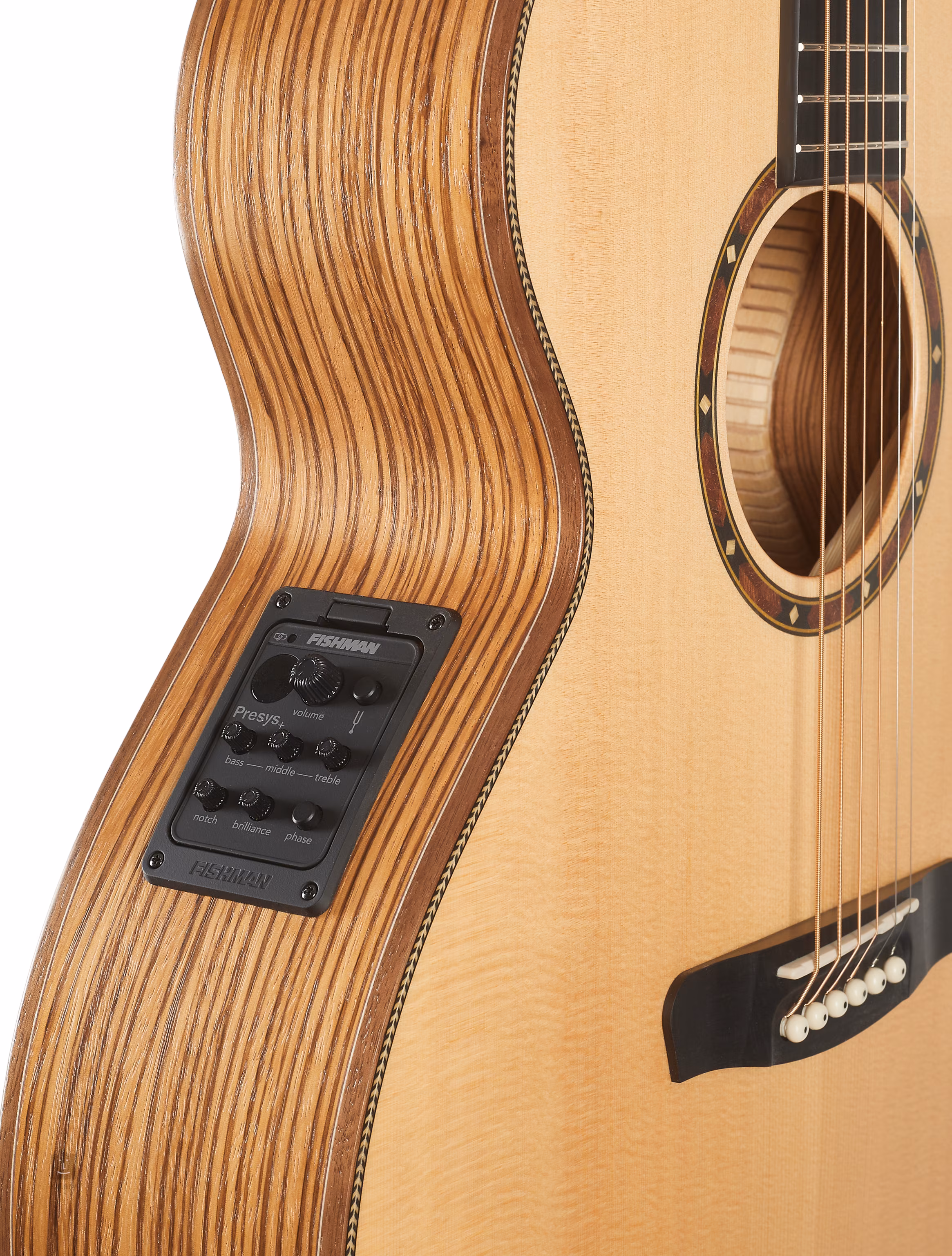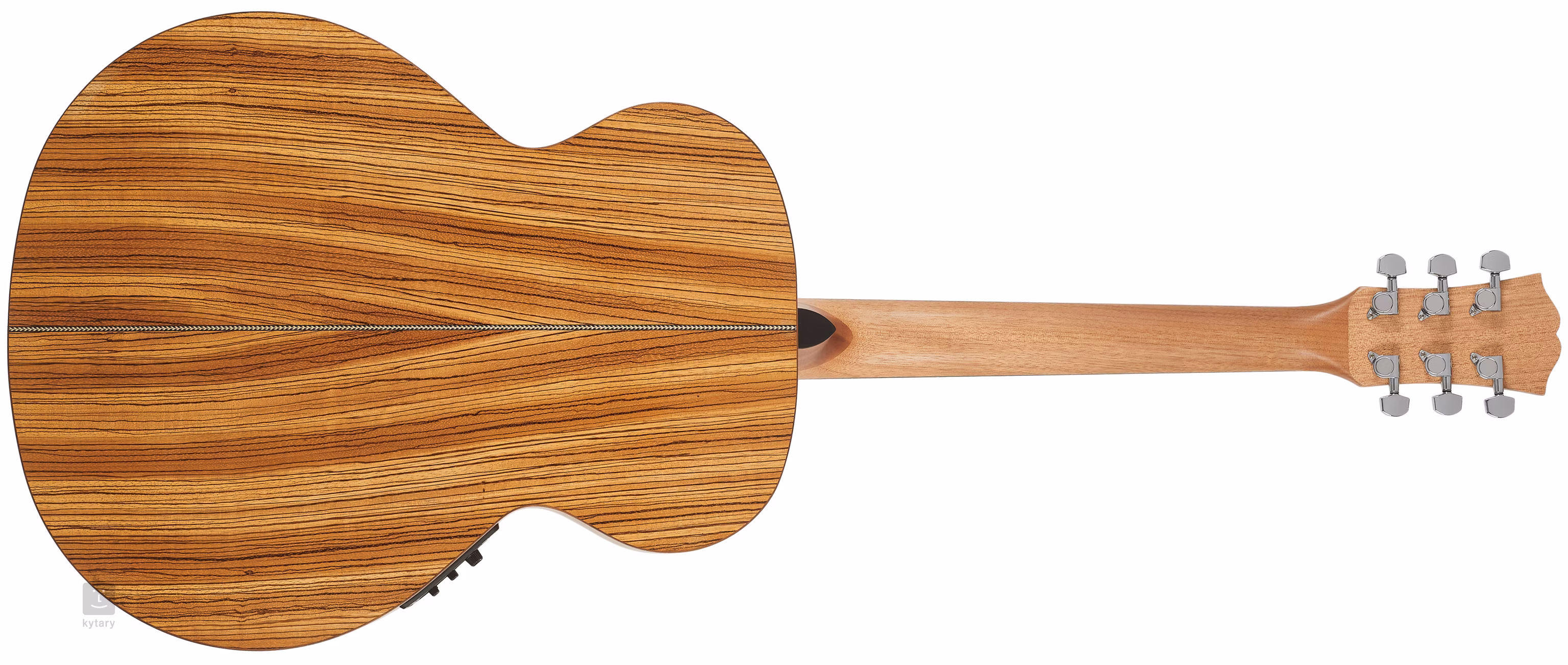 Základ kvalitního zvuku tvoří přední rezonanční deska z masivu kanadského smrku Sitka, ale z vizuálního hlediska je hlavní hvězdou vrstvené exotické zebrano na zadní desce a lubech. Přirozený zvuk nástroje zvýrazňuje povrchová úprava s otevřenými póry.