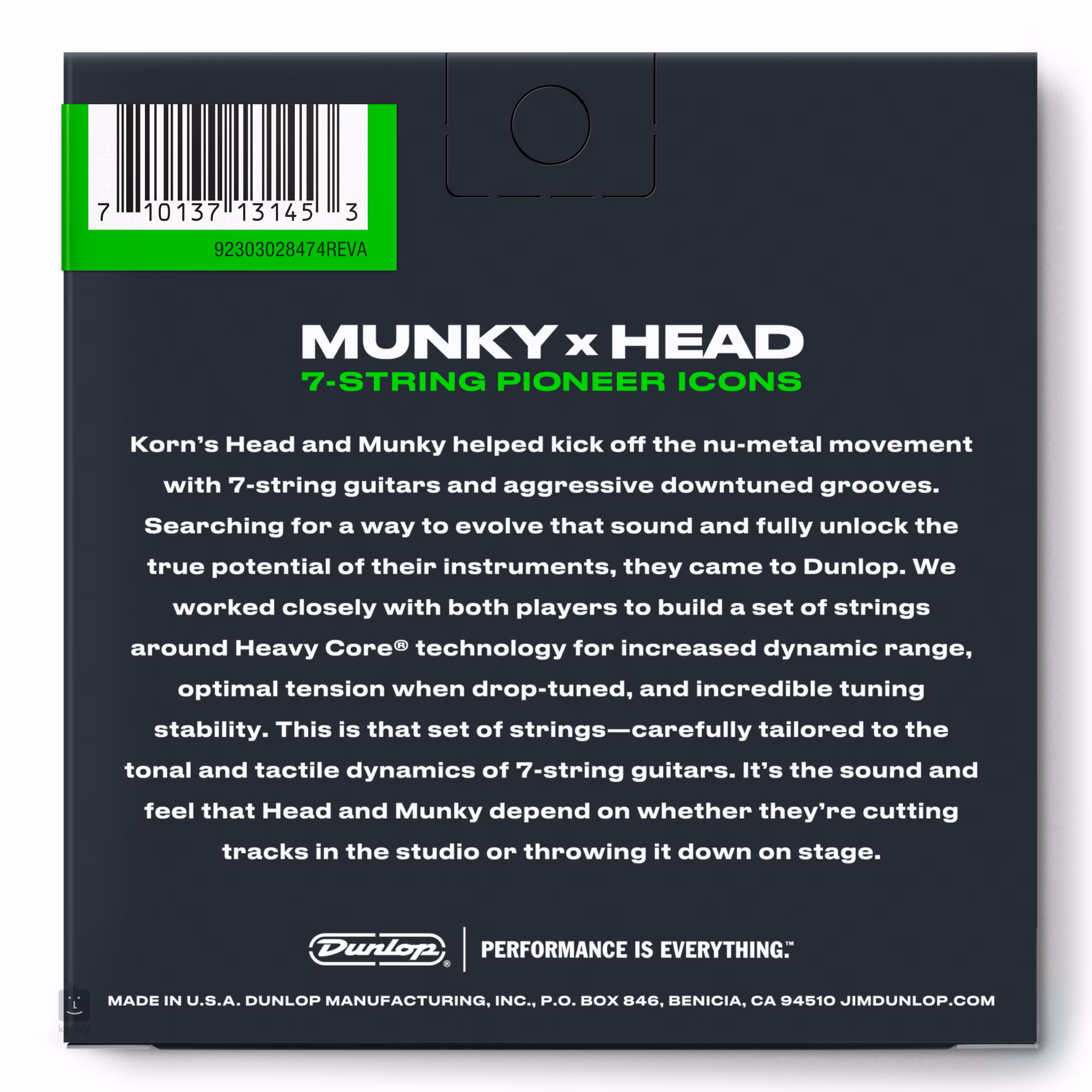 Head a Munky z kapely Korn jsou známí jako průkopníci nu-metalu, který vyhnali na výsluní pomocí sedmistrunných kytar a agresivních podladěných groovů. Firma Dunlop s nimi spojila hlavy dohromady a vytvořila signature sadu strun, která poskytuje větší dynamický rozsah, optimální tenzi i při podladění a neuvěřitelnou stabilitu ladění. Struny vychází ze série Heavy Core. Součástí je také signature trsátko z materiálu tortex.