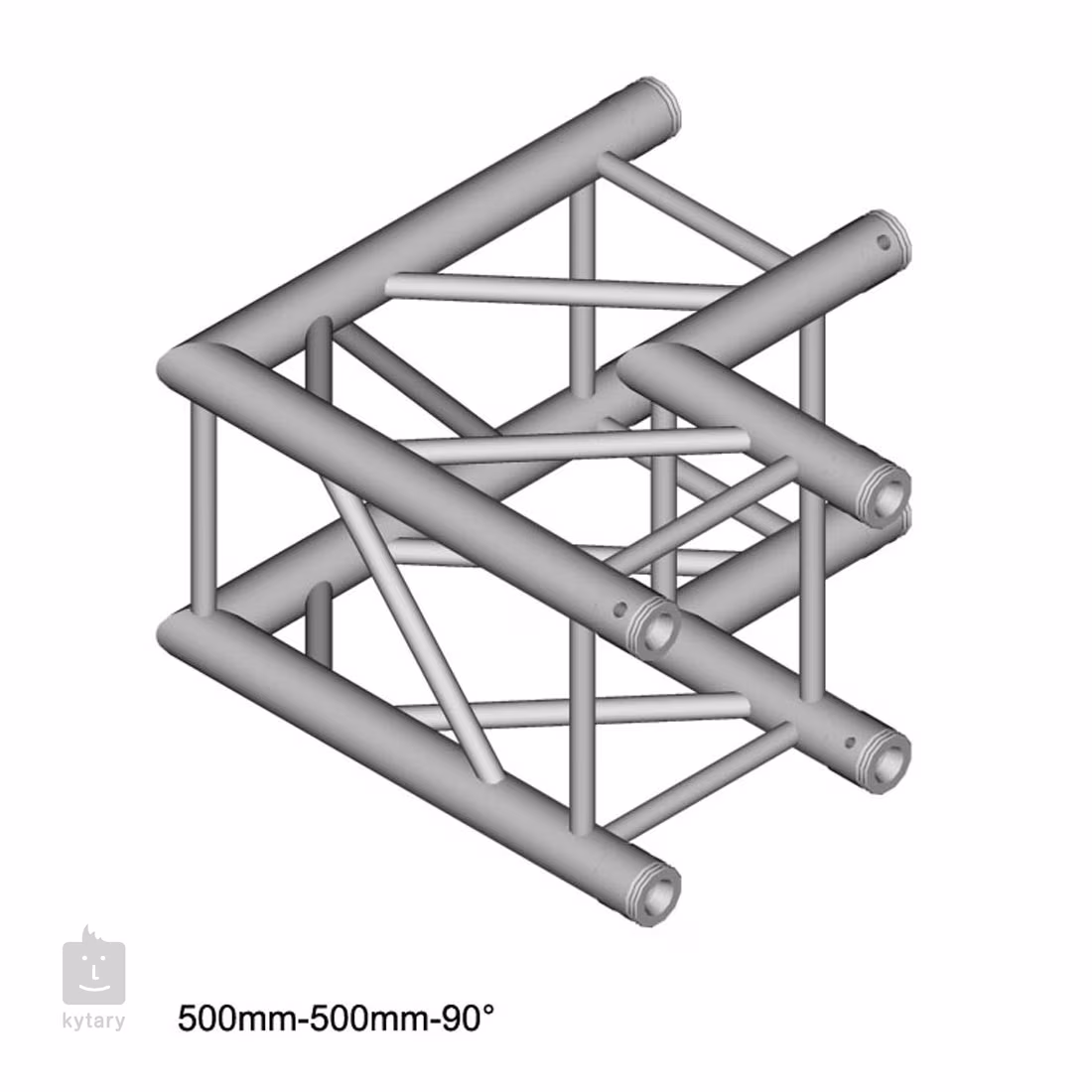 DuraTruss DT 34-C21-L90 je rohový díl čtyřbodové hliníkové konstrukce z řady DT34, který se láme pod úhlem 90°. Tato série je oblíbená pro vysokou pevnost a nosnost, což z ní dělá ideální volbu pro stavbu spolehlivých mobilních pódií. Hlavní trubky konstrukce jsou vyrobeny z odolného hliníku a mají průměr 50 mm, přičemž tloušťka stěny je 2 mm. Příhrady o průměru 16 mm se pak starají o pevné spojení s možností vysokého zatížení. Díky inovativnímu spojovacímu mechanismu systém zajišťuje bleskurychlou instalaci a demontáž, ideální pro časté používání. Součástí balení jsou veškeré potřebné spojovací komponenty.