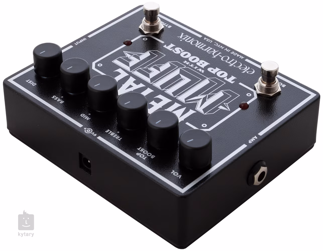 Electro Harmonix Metal Muff je hi-gain distortion pedál s přidaným samostatným obvodem boosteru. Už název jednoznačně naznačuje, komu je pedál určen – tenhle dýdžej nepouští jazz ani oldies rock, jenom metal. Krabička jde, tak jako mnohé jiné pedály z dílen EHX, cestou relativní jednoduchosti, kdy máte k dispozici třípásmový ekvalizér, ovladač výstupní hlasitosti, míry zkreslení a potenciometr Top Boost, jehož nastavení určuje hlasitostní skok po zapnutí sekce Boost. Co chtít víc.